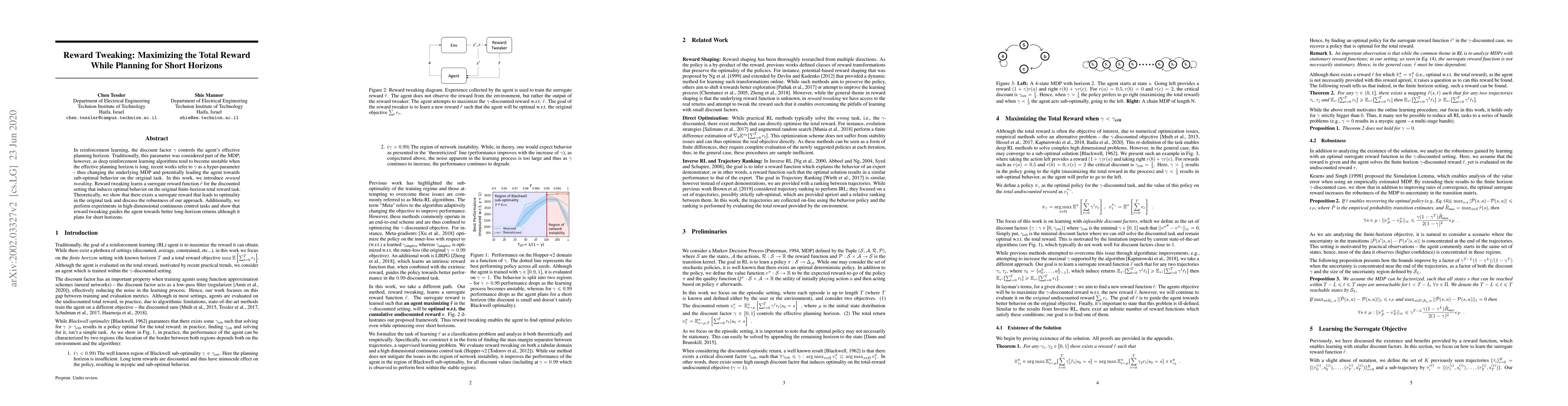 This paper introduces "reward tweaking," a method to learn a surrogate reward that optimizes the original finite-horizon total reward task in reinforcement learning, despite planning for short horizons. Theoretical analysis and experiments in continuous control tasks demonstrate its effectiveness in achieving better long-horizon returns.