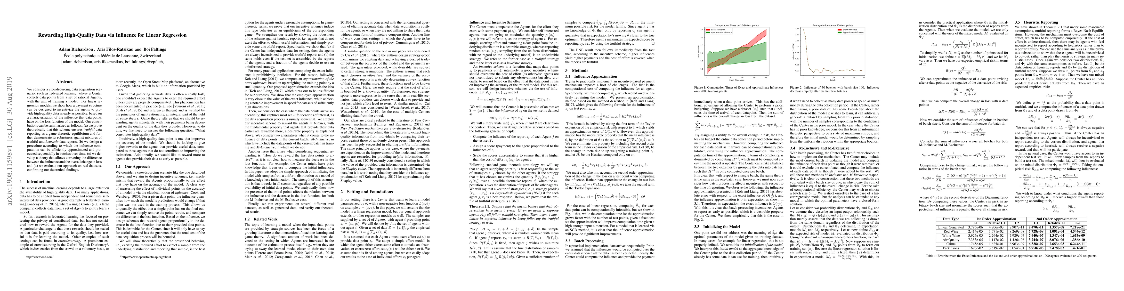 We consider a crowdsourcing data acquisition scenario, such as federated learning, where a Center collects data points from a set of rational Agents, with the aim of training a model. For linear regression models, we show how a payment structure can be designed to incentivize the agents to provide high-quality data as early as possible, based on a characterization of the influence that data points have on the loss function of the model. Our contributions can be summarized as follows: (a) we prove theoretically that this scheme ensures truthful data reporting as a game-theoretic equilibrium and further demonstrate its robustness against mixtures of truthful and heuristic data reports, (b) we design a procedure according to which the influence computation can be efficiently approximated and processed sequentially in batches over time, (c) we develop a theory that allows correcting the difference between the influence and the overall change in loss and (d) we evaluate our approach on real datasets, confirming our theoretical findings.