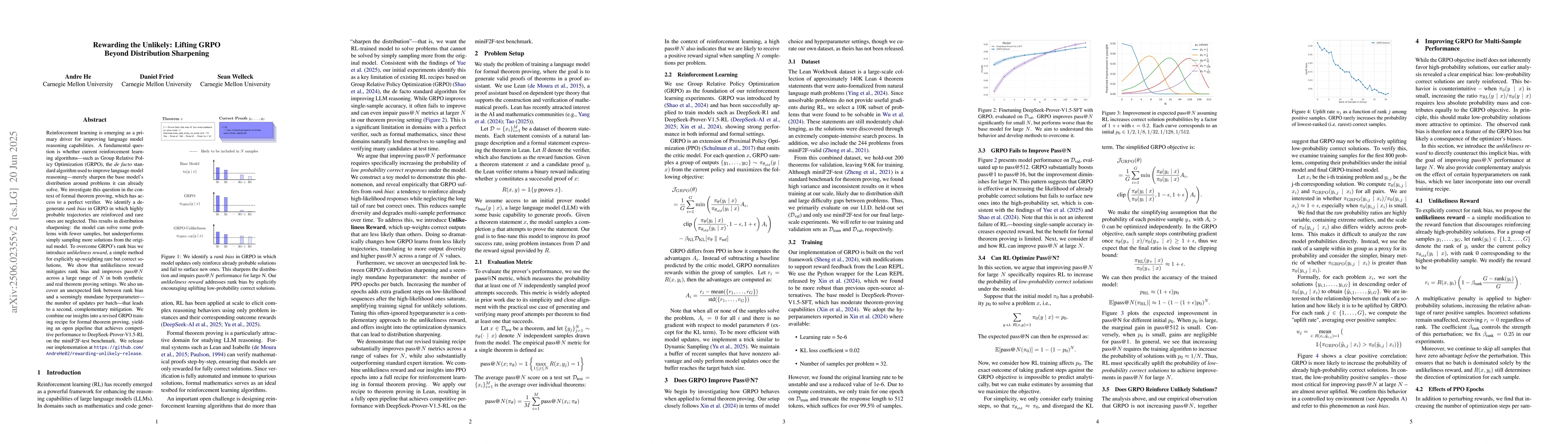 Reinforcement learning is emerging as a primary driver for improving language model reasoning capabilities. A fundamental question is whether current reinforcement learning algorithms -- such as Group Relative Policy Optimization (GRPO), the de facto standard algorithm used to improve language model reasoning -- merely sharpen the base model's distribution around problems it can already solve. We investigate this question in the context of formal theorem proving, which has access to a perfect verifier. We identify a degenerate rank bias in GRPO in which highly probable trajectories are reinforced and rare ones are neglected. This results in distribution sharpening: the model can solve some problems with fewer samples, but underperforms simply sampling more solutions from the original model. To overcome GRPO's rank bias we introduce unlikeliness reward, a simple method for explicitly up-weighting rare but correct solutions. We show that unlikeliness reward mitigates rank bias and improves pass@$N$ across a large range of $N$ in both synthetic and real theorem proving settings. We also uncover an unexpected link between rank bias and a seemingly mundane hyperparameter -- the number of updates per batch -- that leads to a second, complementary mitigation. We combine our insights into a revised GRPO training recipe for formal theorem proving, yielding an open pipeline that achieves competitive performance to DeepSeek-Prover-V1.5-RL on the miniF2F-test benchmark. We release our implementation at https://github.com/AndreHe02/rewarding-unlikely-release
