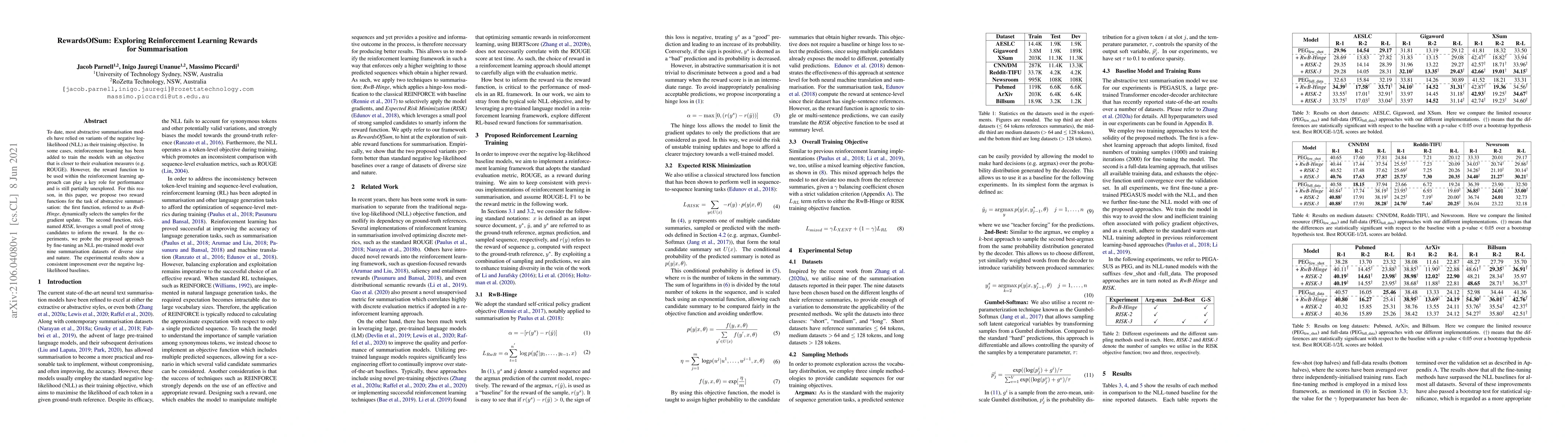 This paper proposes two novel reinforcement learning reward functions for abstractive summarisation: RwB-Hinge and RISK. Experiments demonstrate consistent improvement over traditional negative log-likelihood baselines across nine diverse datasets.