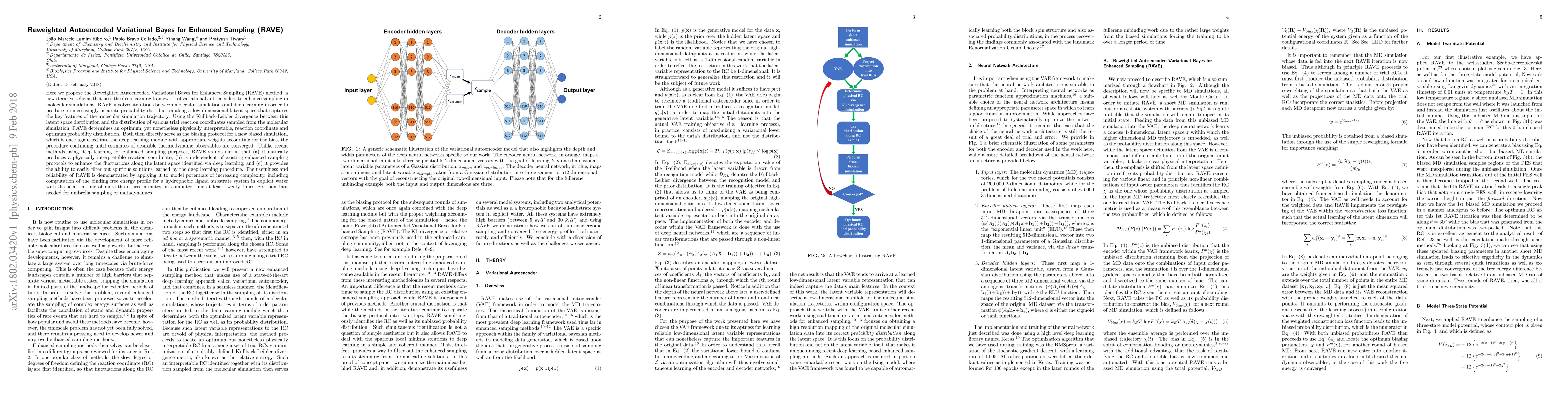 The RAVE method employs variational autoencoders to iteratively enhance sampling in molecular simulations, producing an interpretable reaction coordinate and probability distribution that serve as biasing protocols for efficient computation of thermodynamic observables. Unlike other deep learning methods, RAVE offers physical interpretability, independence from existing protocols, and the ability to filter spurious solutions.