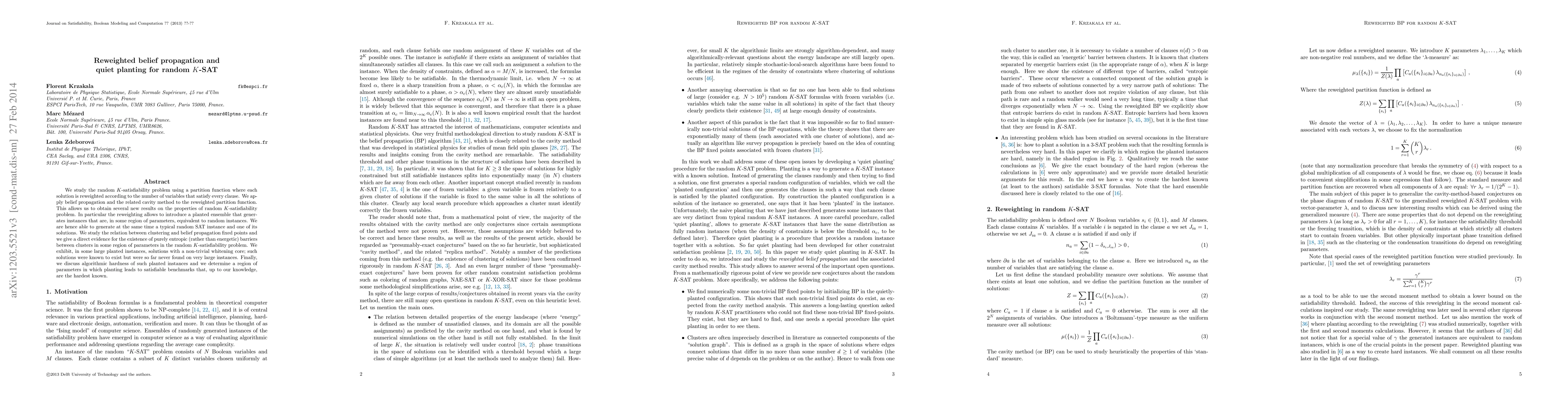 This paper investigates the random K-SAT problem using a reweighted partition function and belief propagation, revealing new insights into the properties of the problem. It introduces a quiet planting method to generate instances equivalent to random ones, demonstrating purely entropic barriers and finding large instances with non-trivial whitening core solutions, ultimately identifying the hardest known satisfiable benchmarks.