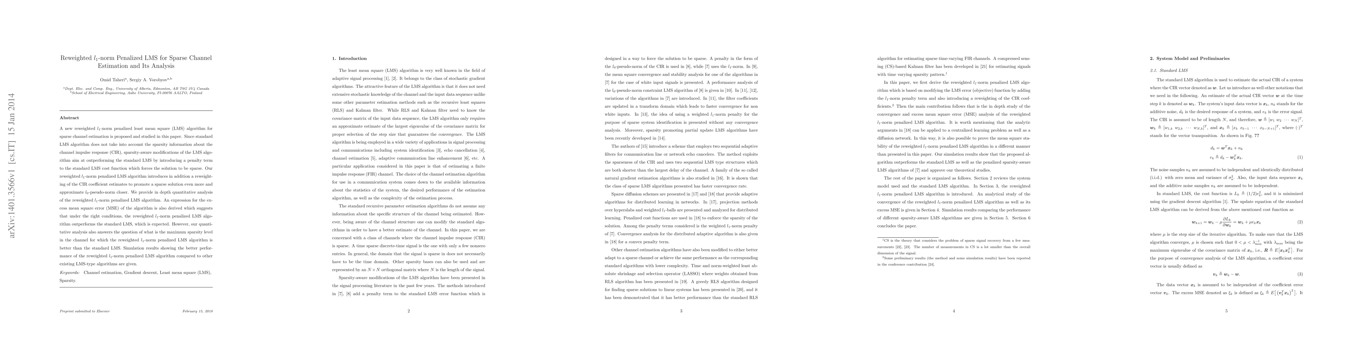 This paper proposes a reweighted l1-norm penalized least mean square (LMS) algorithm for sparse channel estimation, which introduces a reweighting mechanism to enhance sparsity and outperforms the standard LMS. The paper provides a detailed quantitative analysis and derives an expression for the excess mean square error, demonstrating the algorithm's effectiveness under specific conditions.
