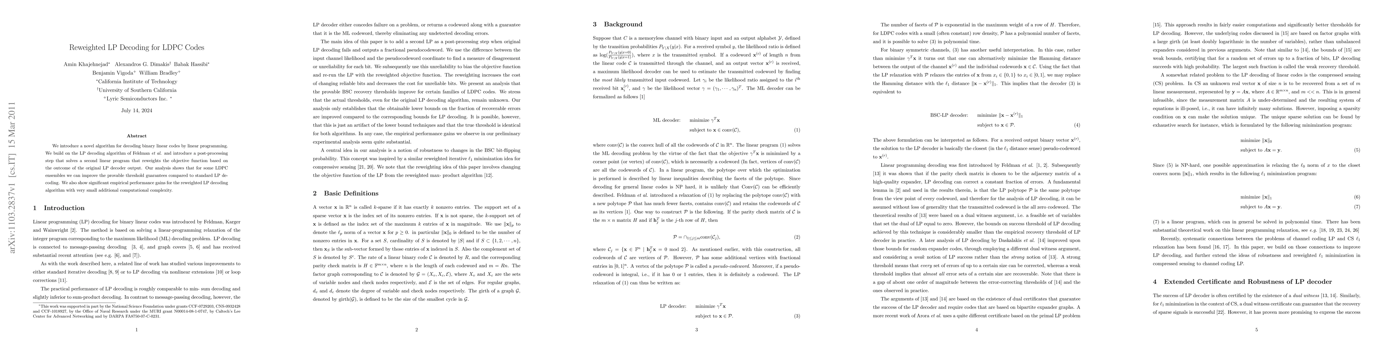 This paper proposes a reweighted LP decoding algorithm for binary linear codes, enhancing the original LP decoding method by solving a second linear program to reweight the objective function. The analysis demonstrates improved threshold guarantees and significant empirical performance gains with minimal extra computational cost.