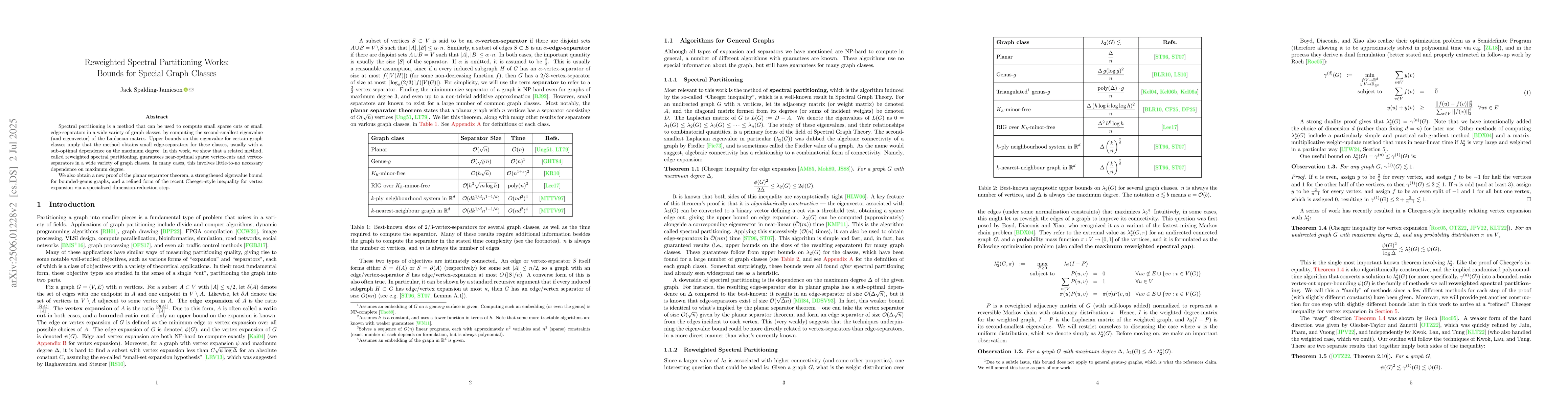 The paper presents a new method, reweighted spectral partitioning, which provides near-optimal vertex-cuts and separators with reduced maximum degree dependence, along with novel proofs for planar separator theorem and a refined Cheeger-style inequality.