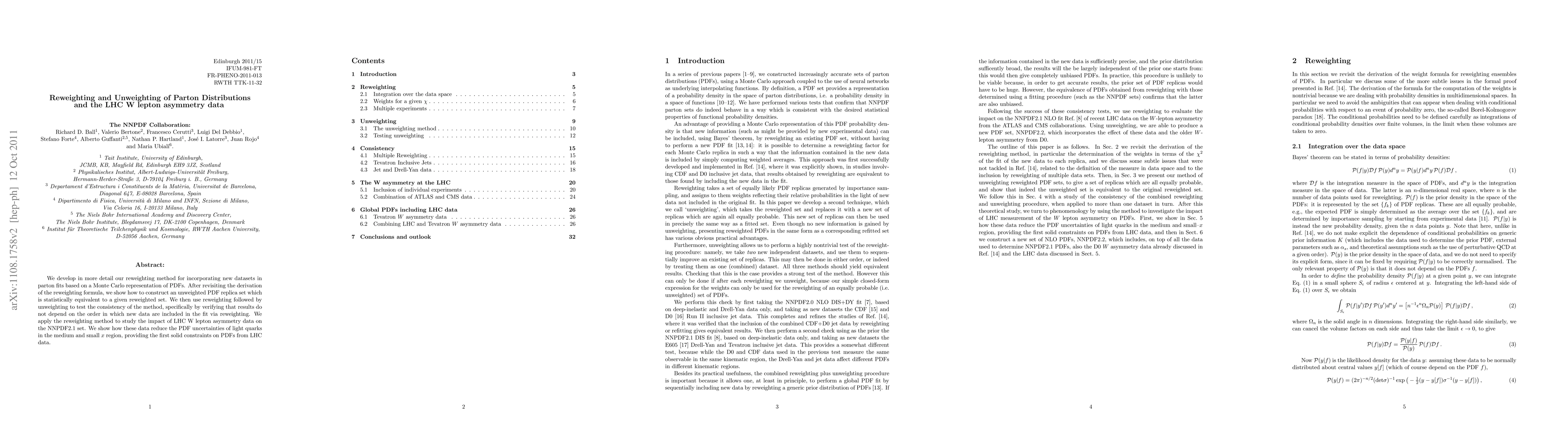 We develop in more detail our reweighting method for incorporating new datasets in parton fits based on a Monte Carlo representation of PDFs. After revisiting the derivation of the reweighting formula, we show how to construct an unweighted PDF replica set which is statistically equivalent to a given reweighted set. We then use reweighting followed by unweighting to test the consistency of the method, specifically by verifying that results do not depend on the order in which new data are included in the fit via reweighting. We apply the reweighting method to study the impact of LHC W lepton asymmetry data on the NNPDF2.1 set. We show how these data reduce the PDF uncertainties of light quarks in the medium and small x region, providing the first solid constraints on PDFs from LHC data.
