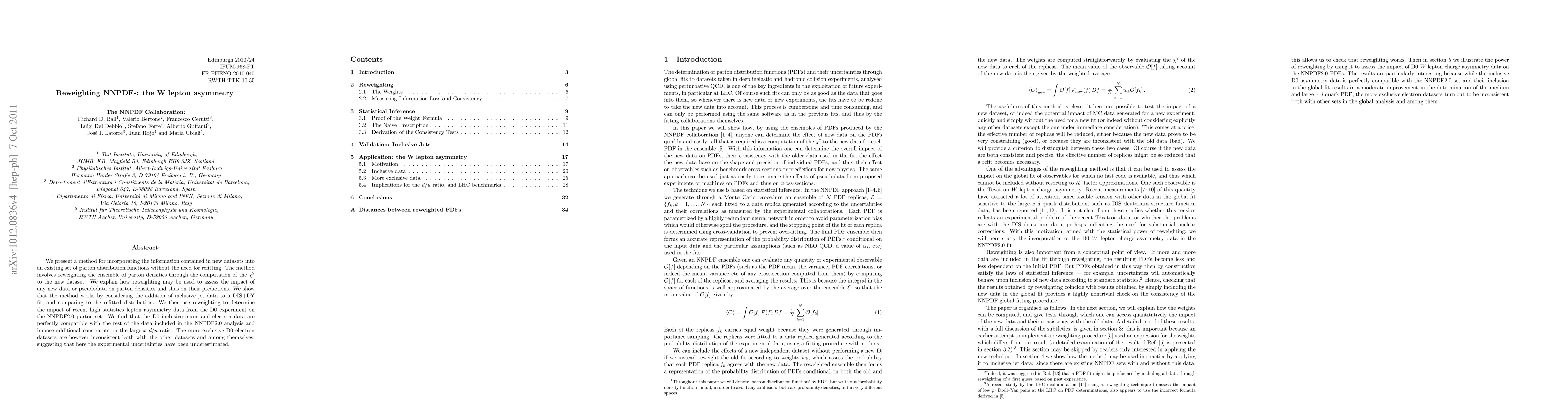 We present a method for incorporating the information contained in new datasets into an existing set of parton distribution functions without the need for refitting. The method involves reweighting the ensemble of parton densities through the computation of the chi-square to the new dataset. We explain how reweighting may be used to assess the impact of any new data or pseudodata on parton densities and thus on their predictions. We show that the method works by considering the addition of inclusive jet data to a DIS+DY fit, and comparing to the refitted distribution. We then use reweighting to determine the impact of recent high statistics lepton asymmetry data from the D0 experiment on the NNPDF2.0 parton set. We find that the D0 inclusive muon and electron data are perfectly compatible with the rest of the data included in the NNPDF2.0 analysis and impose additional constraints on the large-x d/u ratio. The more exclusive D0 electron datasets are however inconsistent both with the other datasets and among themselves, suggesting that here the experimental uncertainties have been underestimated.