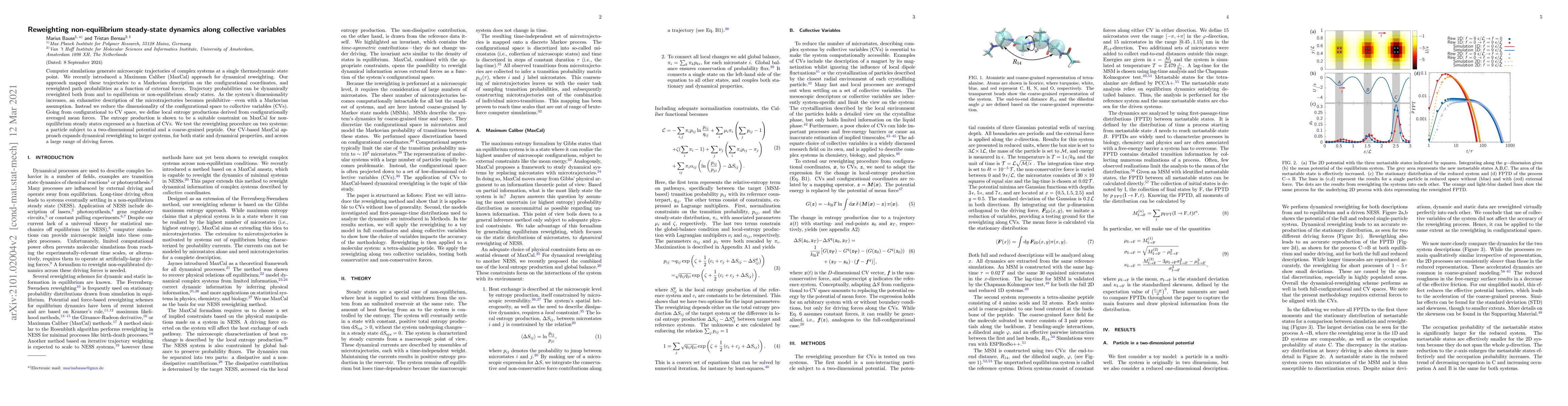 This paper introduces a Maximum Caliber (MaxCal) approach for reweighting non-equilibrium steady-state dynamics using collective variables (CVs) to manage high-dimensional systems. The reweighting method allows for the mapping of microscopic trajectories to a Markovian description and facilitates the analysis of both equilibrium and non-equilibrium states.