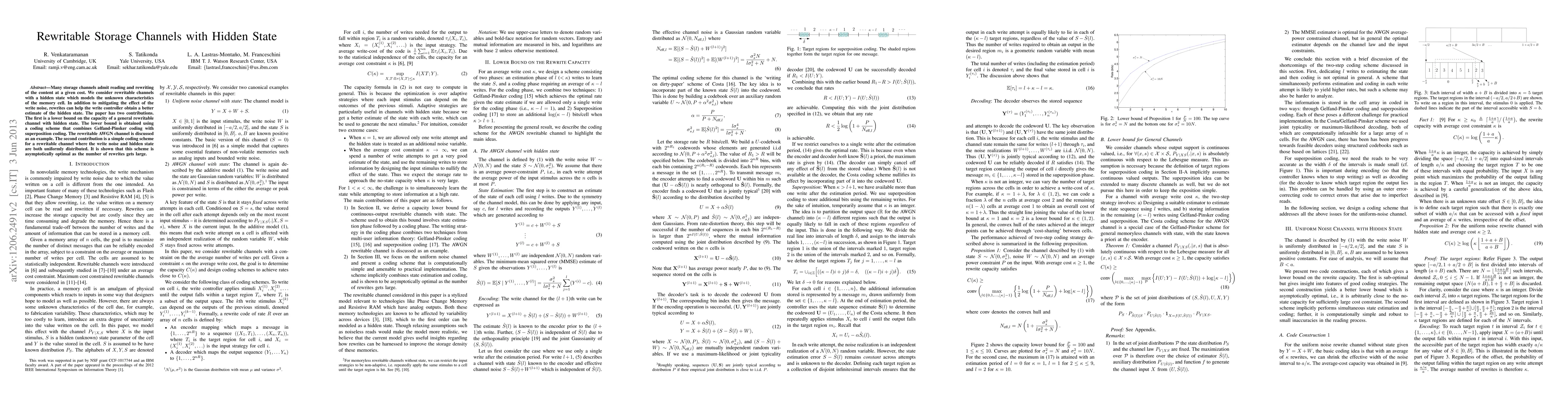 Many storage channels admit reading and rewriting of the content at a given cost. We consider rewritable channels with a hidden state which models the unknown characteristics of the memory cell. In addition to mitigating the effect of the write noise, rewrites can help the write controller obtain a better estimate of the hidden state. The paper has two contributions. The first is a lower bound on the capacity of a general rewritable channel with hidden state. The lower bound is obtained using a coding scheme that combines Gelfand-Pinsker coding with superposition coding. The rewritable AWGN channel is discussed as an example. The second contribution is a simple coding scheme for a rewritable channel where the write noise and hidden state are both uniformly distributed. It is shown that this scheme is asymptotically optimal as the number of rewrites gets large.