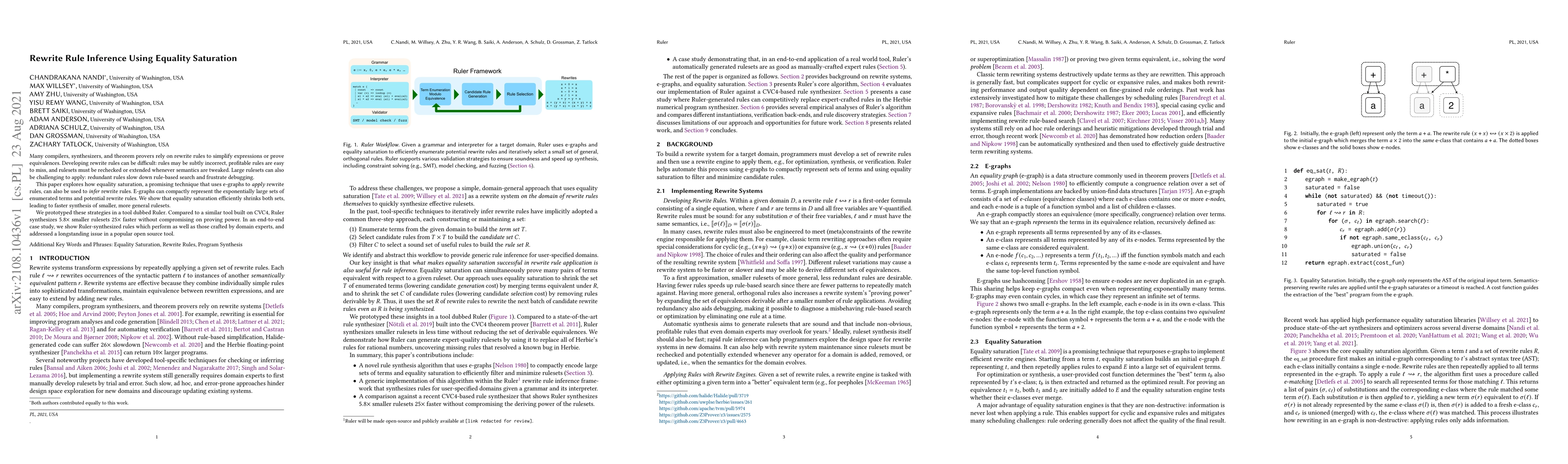 This paper investigates using equality saturation and e-graphs to infer efficient rewrite rules, demonstrating that this approach can generate smaller, more general rulesets 25X faster than existing methods, as shown in a prototype tool called ruler. The synthesized rules perform comparably to expert-crafted rules.