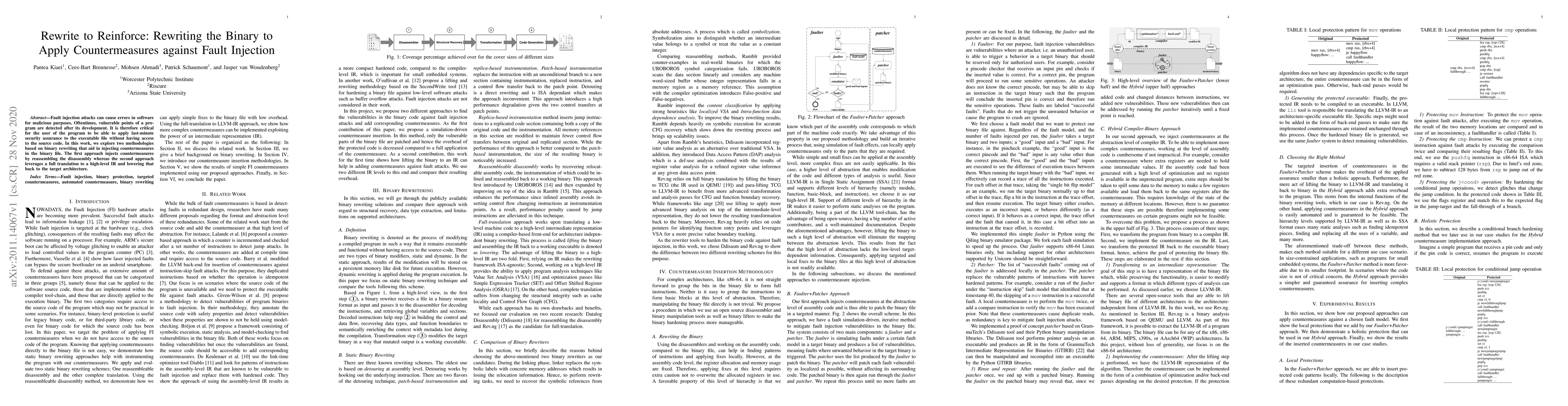Title: Rewrite to Reinforce: Rewriting the Binary to Apply Countermeasures against Fault Injection Summary: This paper investigates two binary rewriting techniques to inject countermeasures into executable files post-development, enabling last-minute security assurance without source code access, aiming to mitigate fault injection attacks.