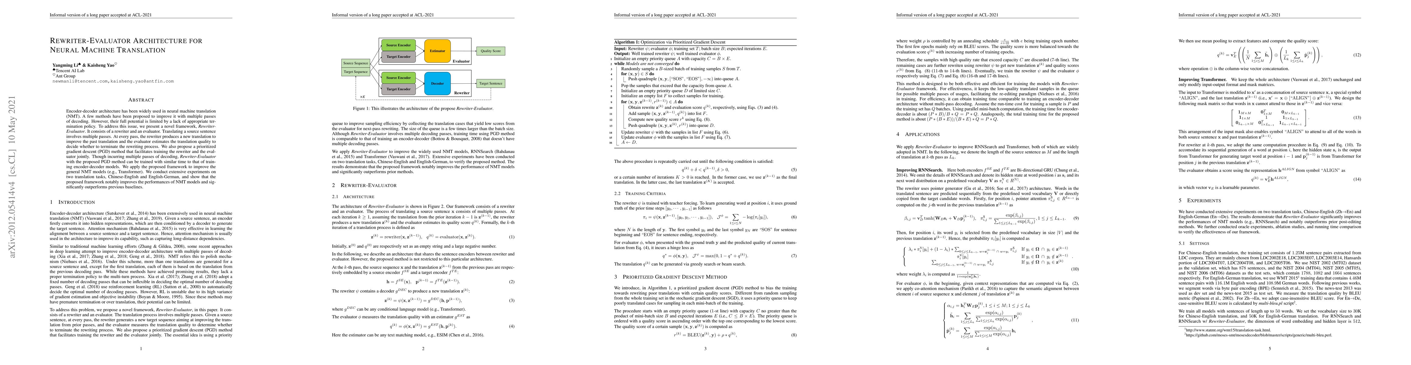 The Rewriter-Evaluator architecture enhances neural machine translation (NMT) by iteratively refining translations through a rewriter and evaluator, improving upon traditional encoder-decoder models. The proposed prioritized gradient descent method enables efficient joint training, leading to significant performance gains over previous baselines in Chinese-English and English-German translation tasks.