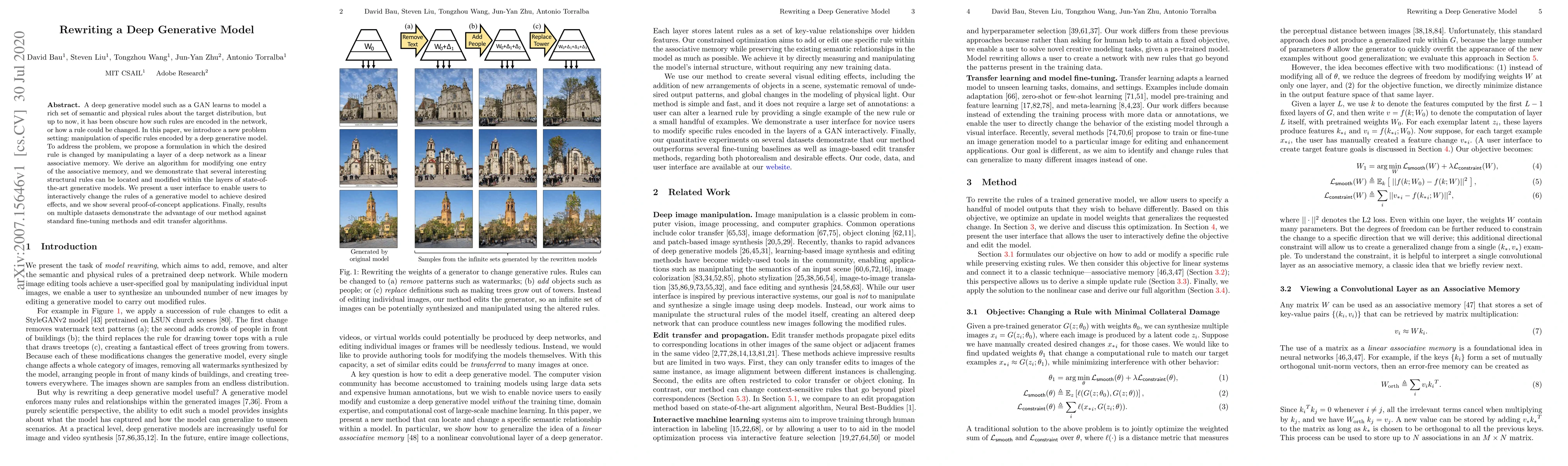 This paper proposes a method to manipulate specific rules encoded in deep generative models like GANs by treating a network layer as a linear associative memory. It introduces an algorithm for modifying these rules and demonstrates its effectiveness through interactive user interface applications and comparisons to standard fine-tuning methods.