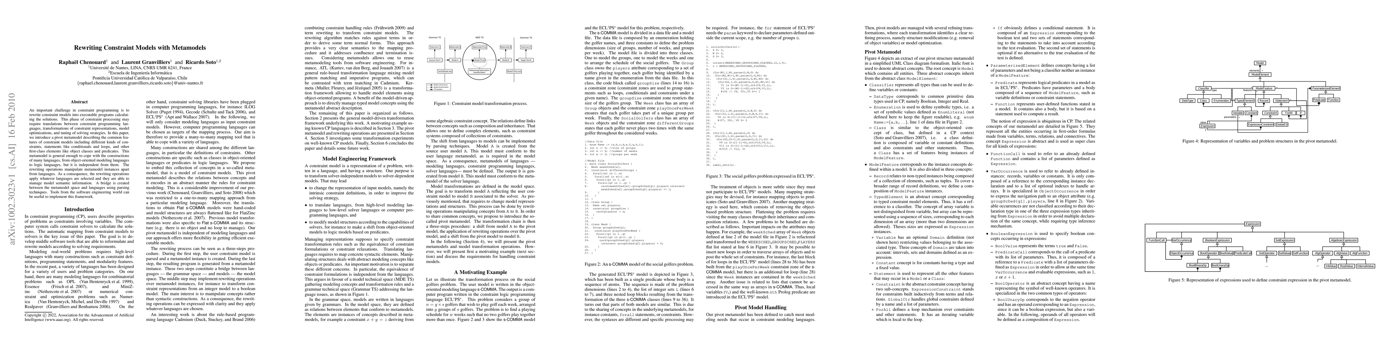An important challenge in constraint programming is to rewrite constraint models into executable programs calculat- ing the solutions. This phase of constraint processing may require translations between constraint programming lan- guages, transformations of constraint representations, model optimizations, and tuning of solving strategies. In this paper, we introduce a pivot metamodel describing the common fea- tures of constraint models including different kinds of con- straints, statements like conditionals and loops, and other first-class elements like object classes and predicates. This metamodel is general enough to cope with the constructions of many languages, from object-oriented modeling languages to logic languages, but it is independent from them. The rewriting operations manipulate metamodel instances apart from languages. As a consequence, the rewriting operations apply whatever languages are selected and they are able to manage model semantic information. A bridge is created between the metamodel space and languages using parsing techniques. Tools from the software engineering world can be useful to implement this framework.