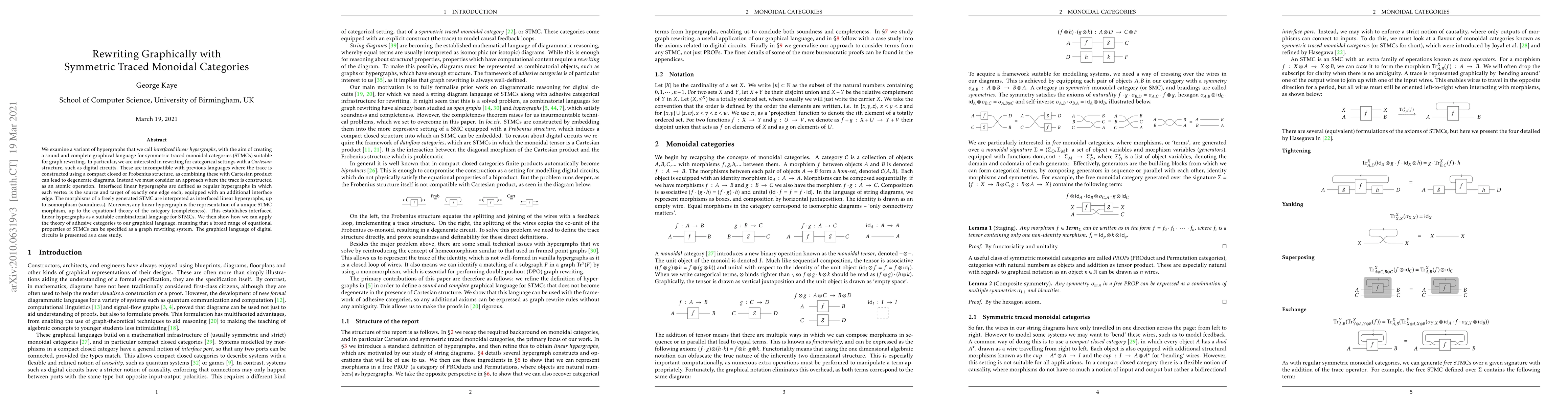 This paper introduces interfaced linear hypergraphs as a sound and complete graphical language for symmetric traced monoidal categories (STMCs), suitable for graph rewriting in categorical settings like digital circuits. It demonstrates the completeness and soundness of this language and applies adhesive category theory to specify a range of STMC properties through graph rewriting.