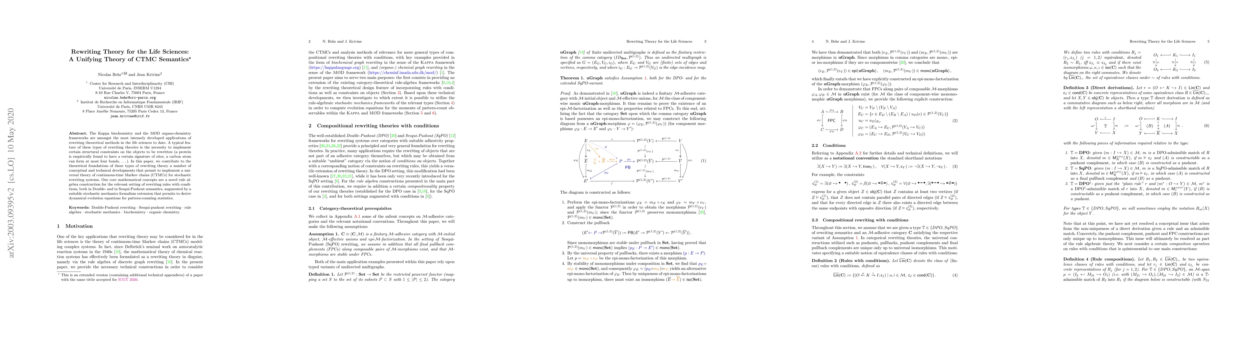 The Kappa biochemistry and the M{\O}D organo-chemistry frameworks are amongst the most intensely developed applications of rewriting theoretical methods in the life sciences to date. A typical feature of these types of rewriting theories is the necessity to implement certain structural constraints on the objects to be rewritten (a protein is empirically found to have a certain signature of sites, a carbon atom can form at most four bonds, ...). In this paper, we contribute to the theoretical foundations of these types of rewriting theory a number of conceptual and technical developments that permit to implement a universal theory of continuous-time Markov chains (CTMCs) for stochastic rewriting systems. Our core mathematical concepts are a novel rule algebra construction for the relevant setting of rewriting rules with conditions, both in Double- and in Sesqui-Pushout semantics, augmented by a suitable stochastic mechanics formalism extension that permits to derive dynamical evolution equations for pattern-counting statistics.