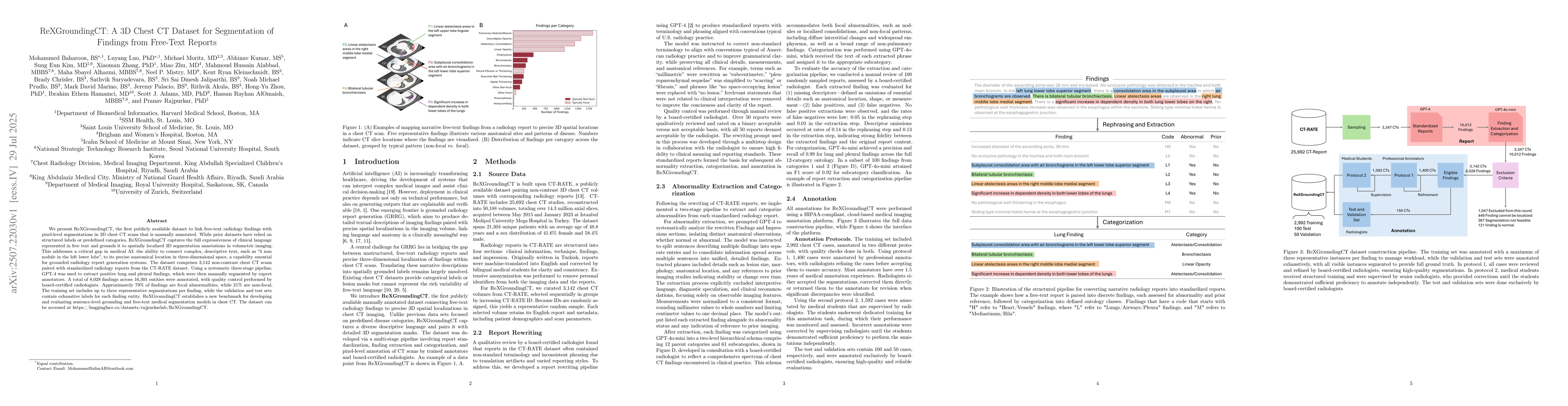 We present ReXGroundingCT, the first publicly available dataset to link free-text radiology findings with pixel-level segmentations in 3D chest CT scans that is manually annotated. While prior datasets have relied on structured labels or predefined categories, ReXGroundingCT captures the full expressiveness of clinical language represented in free text and grounds it to spatially localized 3D segmentation annotations in volumetric imaging. This addresses a critical gap in medical AI: the ability to connect complex, descriptive text, such as "3 mm nodule in the left lower lobe", to its precise anatomical location in three-dimensional space, a capability essential for grounded radiology report generation systems. The dataset comprises 3,142 non-contrast chest CT scans paired with standardized radiology reports from the CT-RATE dataset. Using a systematic three-stage pipeline, GPT-4 was used to extract positive lung and pleural findings, which were then manually segmented by expert annotators. A total of 8,028 findings across 16,301 entities were annotated, with quality control performed by board-certified radiologists. Approximately 79% of findings are focal abnormalities, while 21% are non-focal. The training set includes up to three representative segmentations per finding, while the validation and test sets contain exhaustive labels for each finding entity. ReXGroundingCT establishes a new benchmark for developing and evaluating sentence-level grounding and free-text medical segmentation models in chest CT. The dataset can be accessed at https://huggingface.co/datasets/rajpurkarlab/ReXGroundingCT.