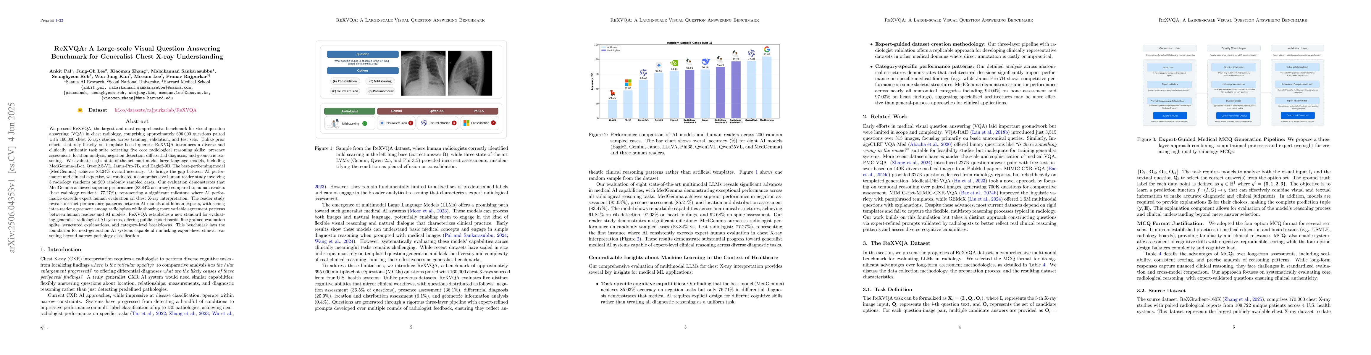 The research introduces ReXVQA, a large-scale VQA benchmark for chest radiology with 696,000 questions paired with 160,000 chest X-ray studies. It evaluates eight state-of-the-art multimodal large language models across five radiological reasoning skills.