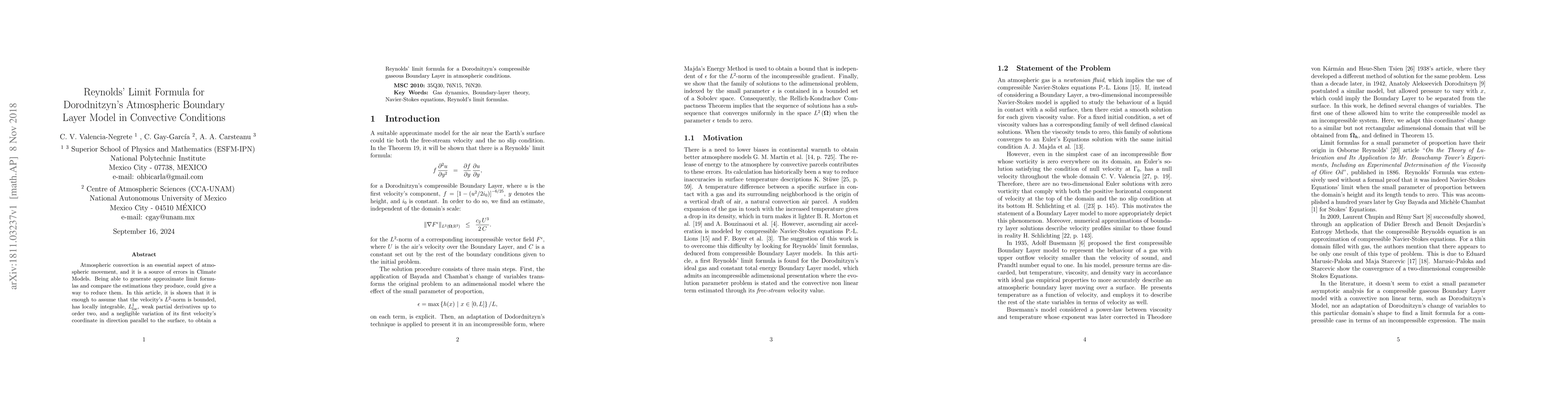 Atmospheric convection is an essential aspect of atmospheric movement, and it is a source of errors in Climate Models. Being able to generate approximate limit formulas and compare the estimations they produce, could give a way to reduce them. In this article, it is shown that it is enough to assume that the velocity's $L^2$-norm is bounded, has locally integrable, $L^1_{loc}$, weak partial derivatives up to order two, and a negligible variation of its first velocity's coordinate in direction parallel to the surface, to obtain a Reynolds' limit formula for a Dorodnitzyn's compressible gaseous Boundary Layer in atmospheric conditions.