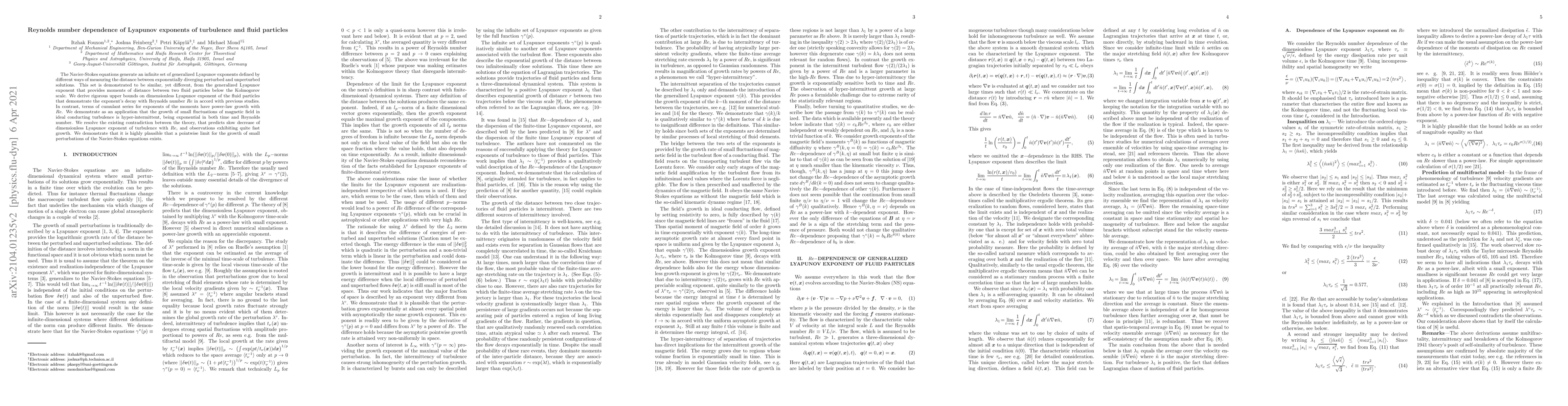The Navier-Stokes equations generate an infinite set of generalized Lyapunov exponents defined by different ways of measuring the distance between exponentially diverging perturbed and unperturbed solutions. This set is demonstrated to be similar, yet different, from the generalized Lyapunov exponent that provides moments of distance between two fluid particles below the Kolmogorov scale. We derive rigorous upper bounds on dimensionless Lyapunov exponent of the fluid particles that demonstrate the exponent's decay with Reynolds number $Re$ in accord with previous studies. In contrast, terms of cumulant series for exponents of the moments have power-law growth with $Re$. We demonstrate as an application that the growth of small fluctuations of magnetic field in ideal conducting turbulence is hyper-intermittent, being exponential in both time and Reynolds number. We resolve the existing contradiction between the theory, that predicts slow decrease of dimensionless Lyapunov exponent of turbulence with $Re$, and observations exhibiting quite fast growth. We demonstrate that it is highly plausible that a pointwise limit for the growth of small perturbations of the Navier-Stokes equations exists.