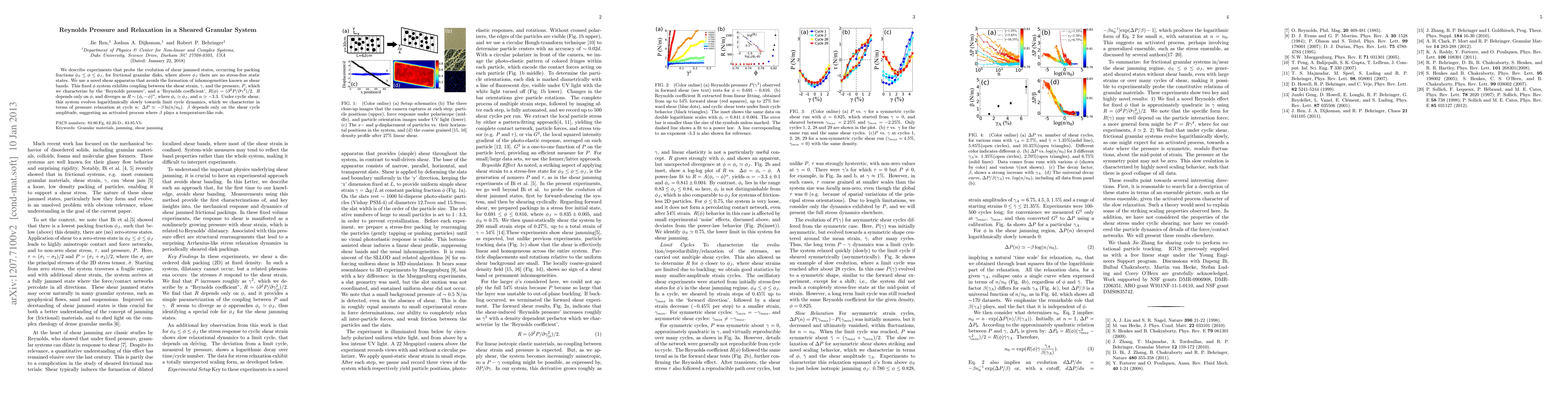 We describe experiments that probe the evolution of shear jammed states, occurring for packing fractions $\phi_S \leq \phi \leq \phi_J$, for frictional granular disks, where above $\phi_J$ there are no stress-free static states. We use a novel shear apparatus that avoids the formation of inhomogeneities known as shear bands. This fixed $\phi$ system exhibits coupling between the shear strain, $\gamma$, and the pressure, $P$, which we characterize by the `Reynolds pressure', and a `Reynolds coefficient', $R(\phi) = (\partial ^2 P/\partial \gamma ^2)/2$. $R$ depends only on $\phi$, and diverges as $R \sim (\phi_c - \phi)^{\alpha}$, where $\phi_c \simeq \phi_J$, and $\alpha \simeq -3.3$. Under cyclic shear, this system evolves logarithmically slowly towards limit cycle dynamics, which we characterize in terms of pressure relaxation at cycle $n$: $\Delta P \simeq -\beta \ln(n/n_0)$. $\beta$ depends only on the shear cycle amplitude, suggesting an activated process where $\beta$ plays a temperature-like role.