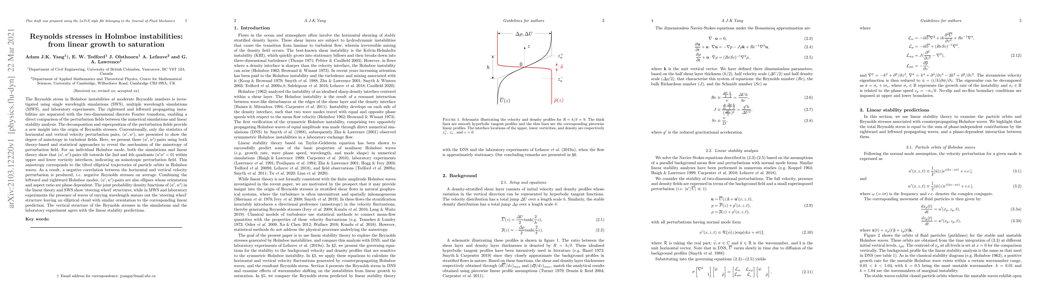 This paper investigates Reynolds stresses in Holmboe instabilities through simulations and experiments, revealing anisotropic perturbation fields and negative correlations between horizontal and vertical velocity perturbations. The study shows that the combined effect of leftward and rightward modes results in elliptical patterns of ($u',w'$) pairs, with the vertical structure of Reynolds stresses aligning with linear stability predictions.