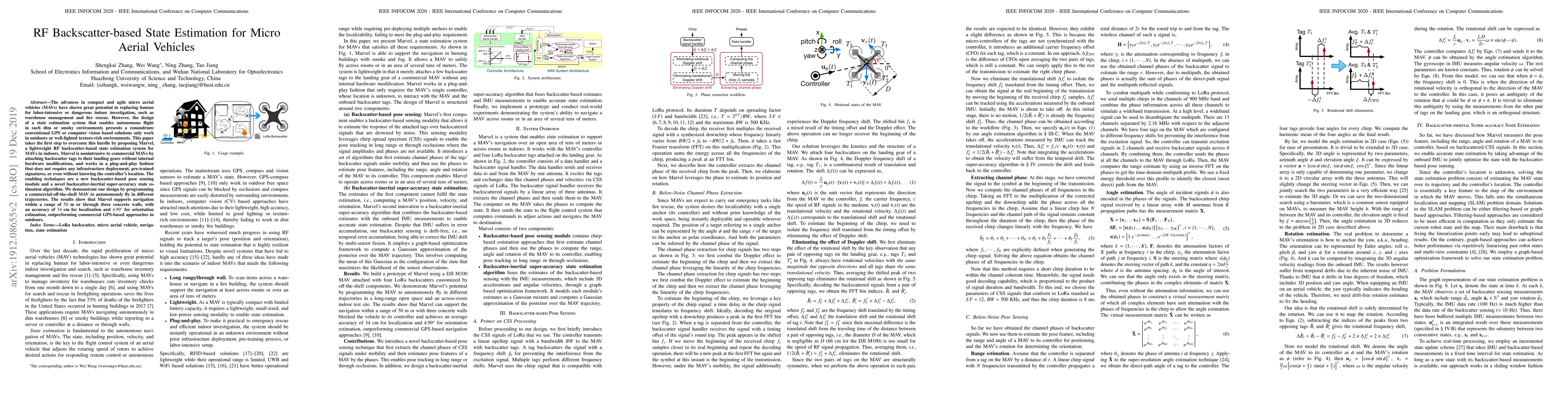 This paper introduces Marvel, a lightweight RF backscatter-based state estimation system for micro aerial vehicles (MAVs) to navigate indoors. Marvel uses backscatter tags and a novel estimation algorithm to achieve accurate localization and orientation without requiring infrastructure or hardware modifications.