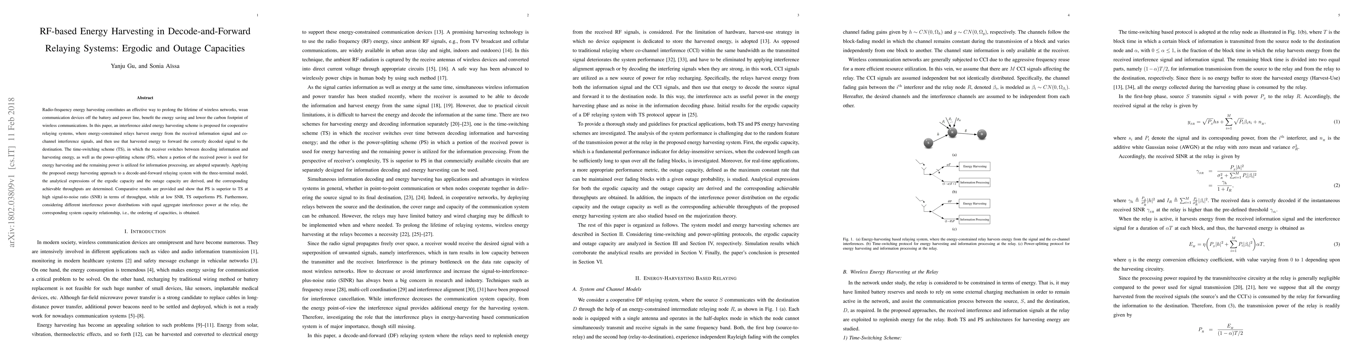 This paper proposes an interference-aided energy harvesting scheme for decode-and-forward relaying systems, comparing time-switching and power-splitting methods. It derives analytical expressions for ergodic and outage capacities, finding that power-splitting is superior at high SNR while time-switching is better at low SNR.