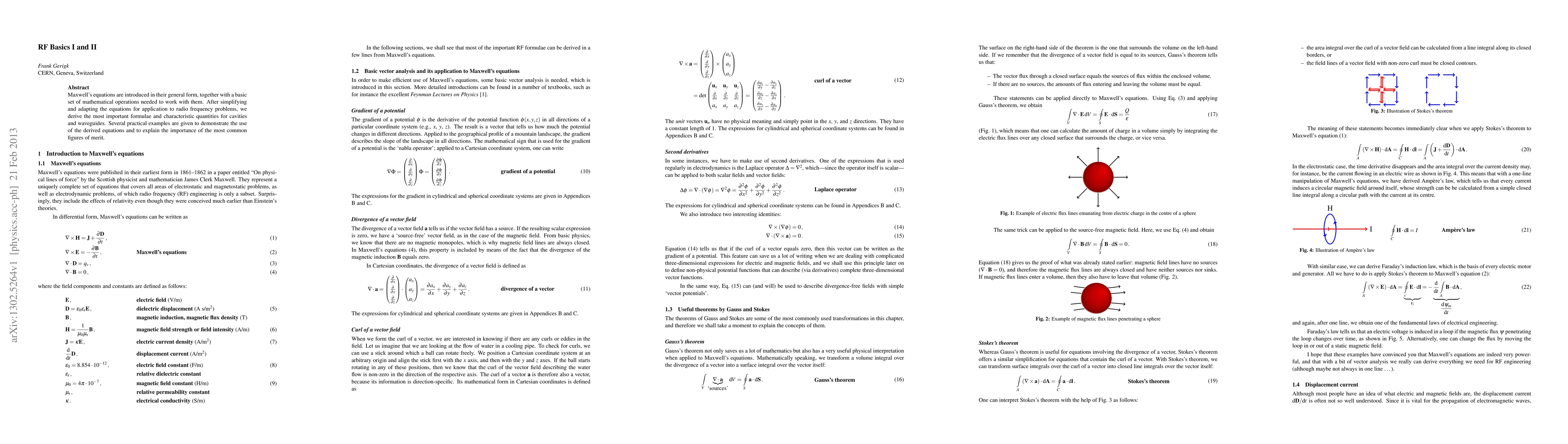 Maxwell's equations are introduced in their general form, together with a basic set of mathematical operations needed to work with them. After simplifying and adapting the equations for application to radio frequency problems, we derive the most important formulae and characteristic quantities for cavities and waveguides. Several practical examples are given to demonstrate the use of the derived equations and to explain the importance of the most common figures of merit.