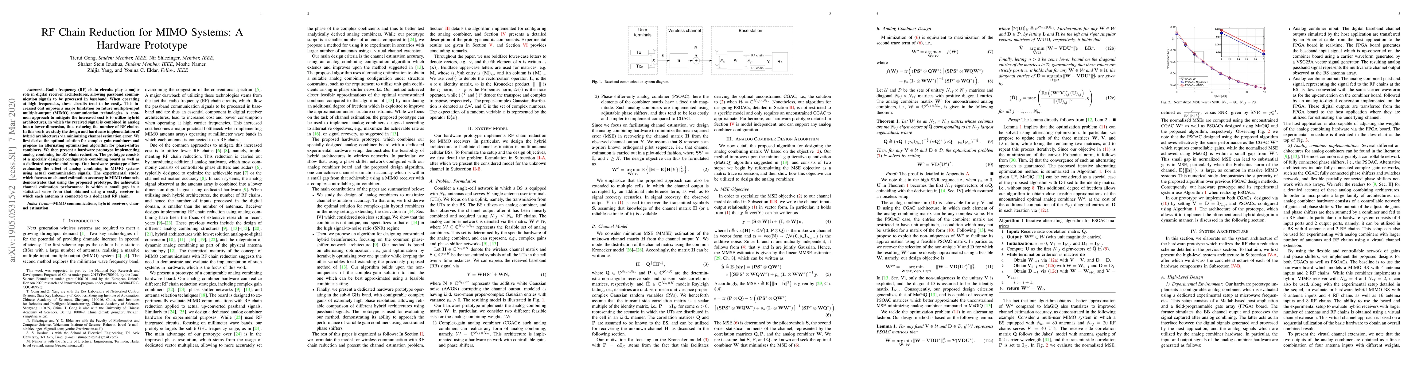 This paper explores the design and implementation of hybrid RF chain architectures for MIMO systems to reduce costs by minimizing channel estimation error. The authors present a hardware prototype that evaluates analog combining techniques, demonstrating comparable channel estimation accuracy to traditional, more expensive designs.