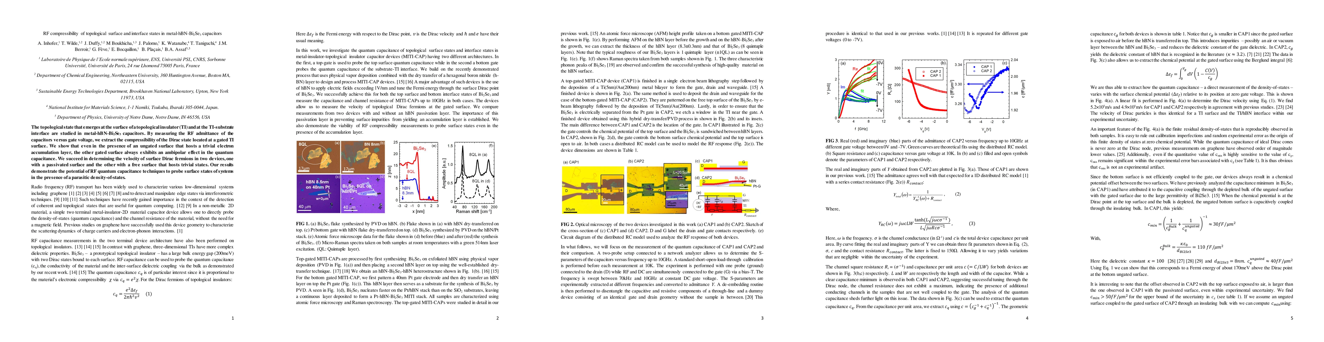 The topological state that emerges at the surface of a topological insulator (TI) and at the TI-substrate interface are studied in metal-hBN-Bi2Se3 capacitors. By measuring the RF admittance of the capacitors versus gate voltage, we extract the compressibility of the Dirac state located at a gated TI surface. We show that even in the presence of an ungated surface that hosts a trivial electron accumulation layer, the other gated surface always exhibits an ambipolar effect in the quantum capacitance. We succeed in determining the velocity of surface Dirac fermions in two devices, one with a passivated surface and the other with a free surface that hosts trivial states. Our results demonstrate the potential of RF quantum capacitance techniques to probe surface states of systems in the presence of a parasitic density-of-states.
