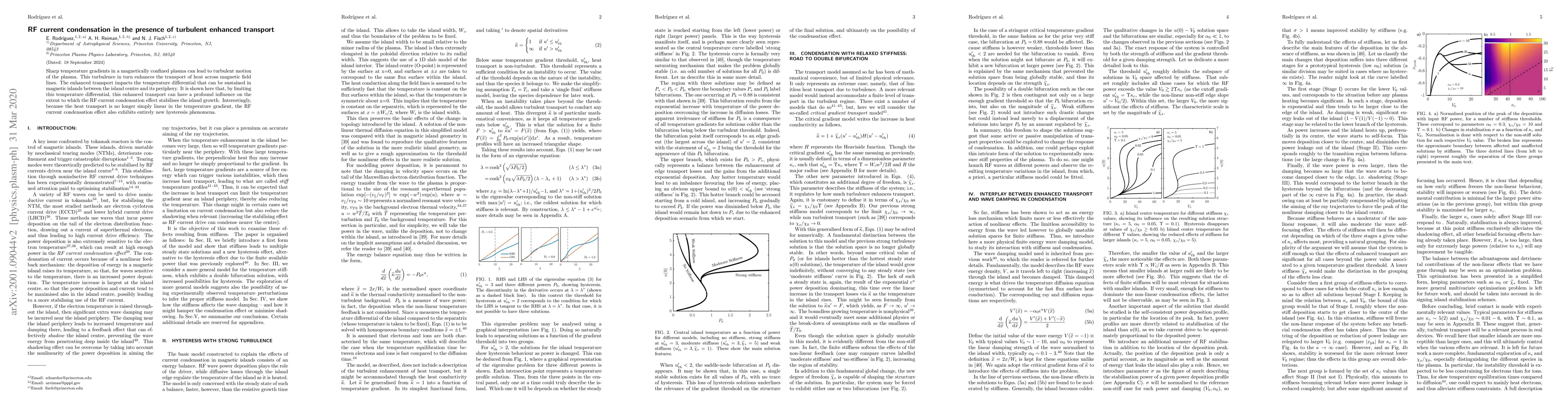 This paper investigates the effect of turbulent enhanced transport on RF current condensation in magnetically confined plasmas, demonstrating that it can stabilize magnetic island growth by limiting temperature differentials and introducing new hysteresis phenomena.