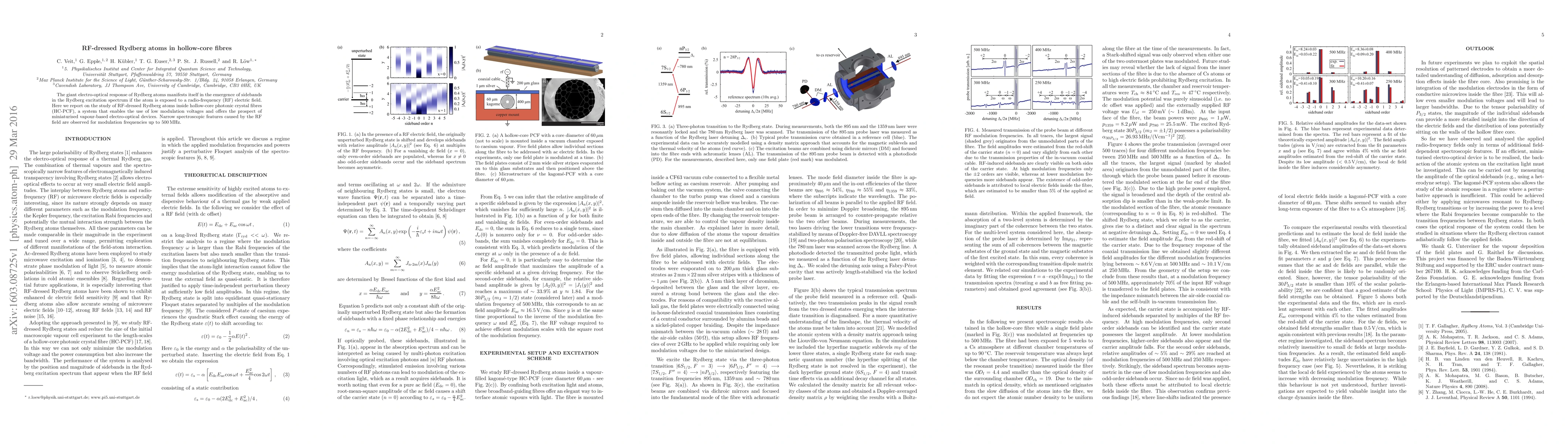 The study examines RF-dressed Rydberg atoms inside a vapor-filled kagome-type hollow-core photonic crystal fiber (HC-PCF) with a core diameter of 60 µm. The fiber is mounted in a vacuum chamber exposed to caesium vapor, with five field plates allowing individual sections along the fiber to be addressed with electric fields. The Rydberg state is excited via a three-photon transition, and the atomic system is modeled using a density matrix approach considering magnetic sublevels, thermal velocity of atoms, and transit time effects.