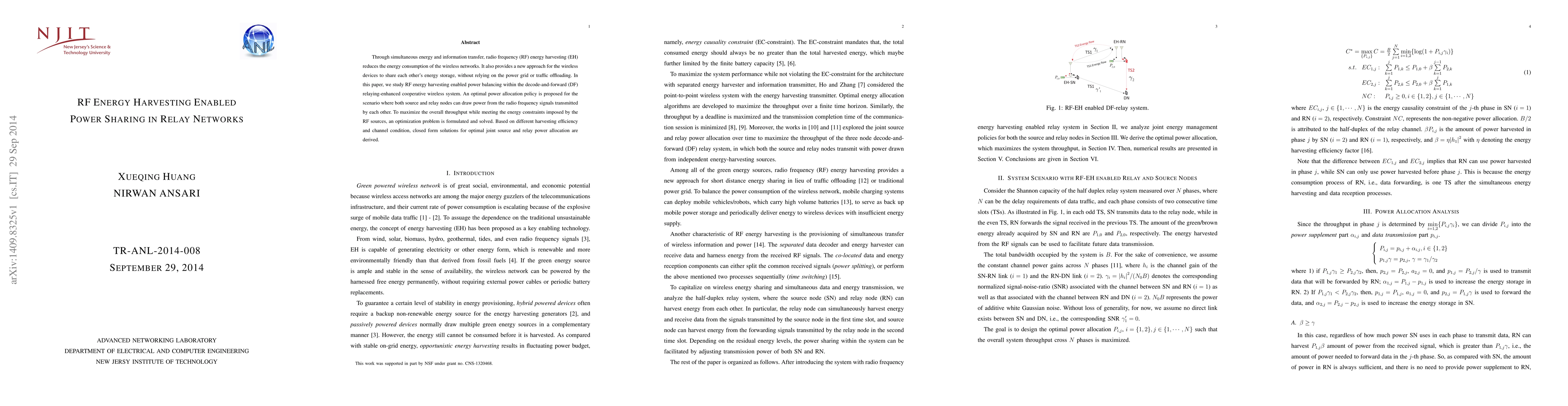 This paper proposes an optimal power allocation policy for decode-and-forward relay networks utilizing RF energy harvesting to balance power consumption. It formulates and solves an optimization problem to maximize throughput while meeting energy constraints, deriving closed-form solutions for joint source and relay power allocation.