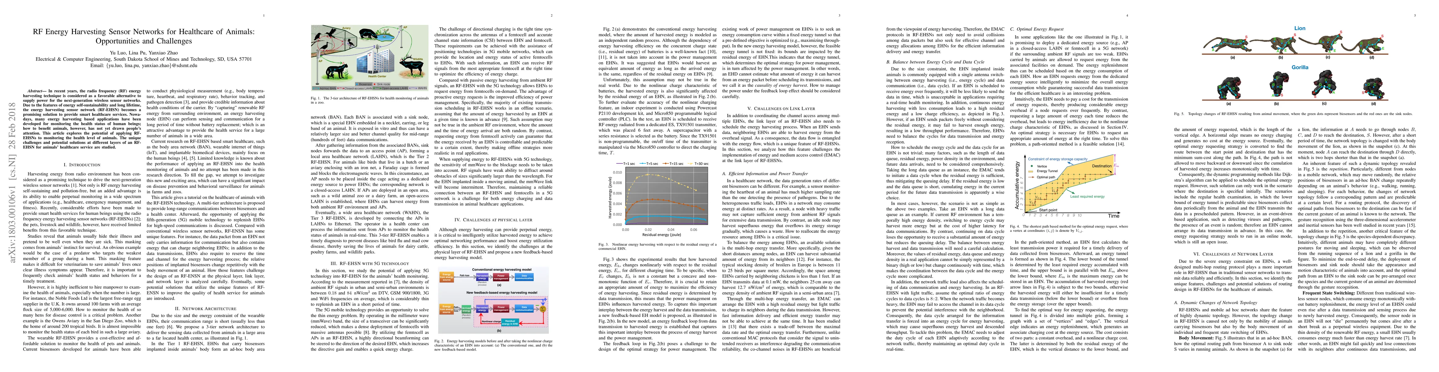In recent years, the radio frequency (RF) energy harvesting technique is considered as a favorable alternative to supply power for the next-generation wireless sensor networks. Due to the features of energy self-sustainability and long lifetime, the energy harvesting sensor network (RF-EHSN) becomes a promising solution to provide smart healthcare services. Nowadays, many energy harvesting based applications have been developed for monitoring the health status of human beings; how to benefit animals, however, has not yet drawn people's attention. This article explores the potential of applying RF-EHSNs to monitoring the health level of animals. The unique challenges and potential solutions at different layers of an RF-EHSN for animals' healthcare service are studied.