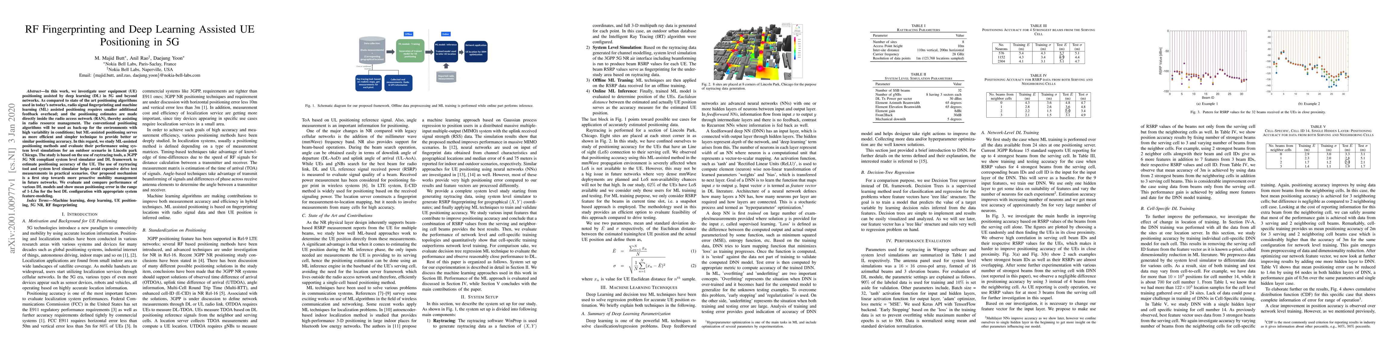 This paper explores user equipment positioning in 5G networks using radio signal fingerprinting and deep learning, demonstrating reduced feedback overhead and improved positioning accuracy compared to conventional methods. Performance evaluations using simulations show mean positioning errors of 1-1.5 meters for the best deep learning configurations.