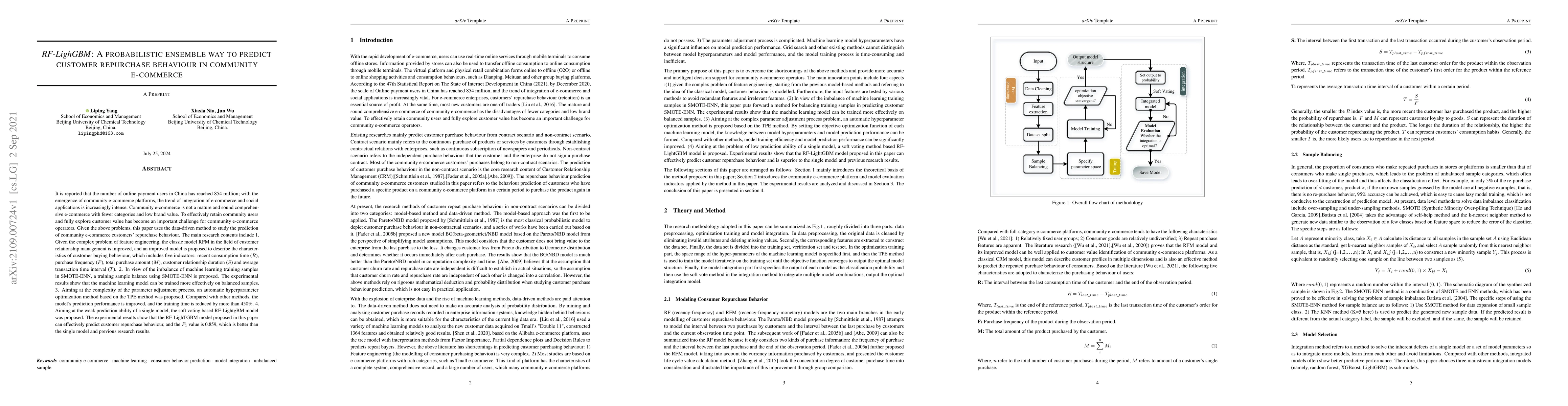 It is reported that the number of online payment users in China has reached 854 million; with the emergence of community e-commerce platforms, the trend of integration of e-commerce and social applications is increasingly intense. Community e-commerce is not a mature and sound comprehensive e-commerce with fewer categories and low brand value. To effectively retain community users and fully explore customer value has become an important challenge for community e-commerce operators. Given the above problems, this paper uses the data-driven method to study the prediction of community e-commerce customers' repurchase behaviour. The main research contents include 1. Given the complex problem of feature engineering, the classic model RFM in the field of customer relationship management is improved, and an improved model is proposed to describe the characteristics of customer buying behaviour, which includes five indicators. 2. In view of the imbalance of machine learning training samples in SMOTE-ENN, a training sample balance using SMOTE-ENN is proposed. The experimental results show that the machine learning model can be trained more effectively on balanced samples. 3. Aiming at the complexity of the parameter adjustment process, an automatic hyperparameter optimization method based on the TPE method was proposed. Compared with other methods, the model's prediction performance is improved, and the training time is reduced by more than 450%. 4. Aiming at the weak prediction ability of a single model, the soft voting based RF-LightgBM model was proposed. The experimental results show that the RF-LighTGBM model proposed in this paper can effectively predict customer repurchase behaviour, and the F1 value is 0.859, which is better than the single model and previous research results.