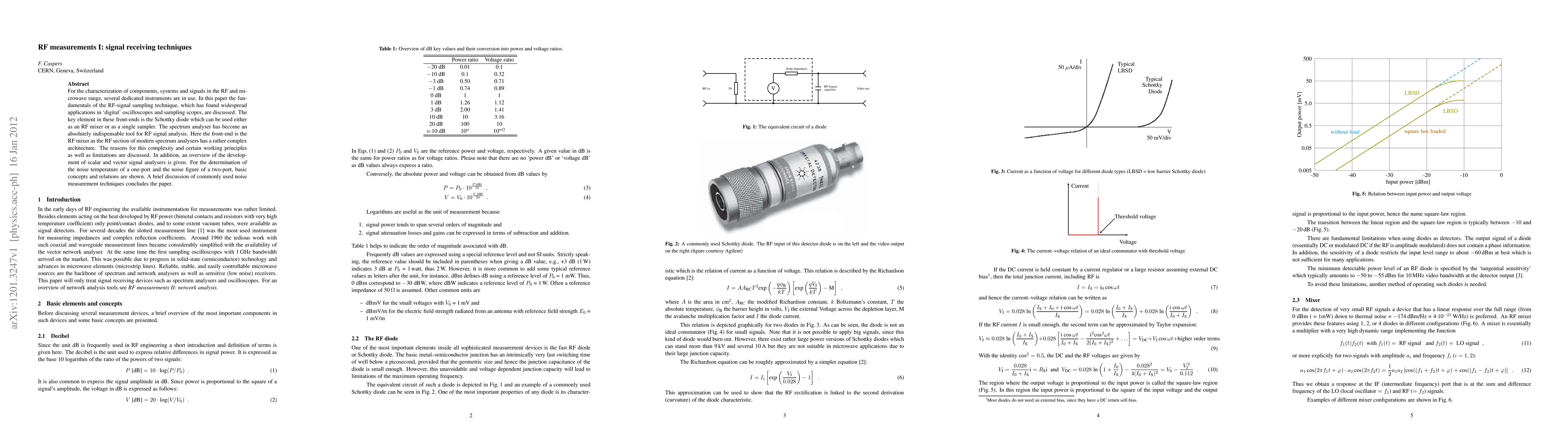For the characterization of components, systems and signals in the RF and microwave range, several dedicated instruments are in use. In this paper the fundamentals of the RF-signal sampling technique, which has found widespread applications in 'digital' oscilloscopes and sampling scopes, are discussed. The key element in these front-ends is the Schottky diode which can be used either as an RF mixer or as a single sampler. The spectrum analyser has become an absolutely indispensable tool for RF signal analysis. Here the front-end is the RF mixer as the RF section of modern spectrum analysers has a rather complex architecture. The reasons for this complexity and certain working principles as well as limitations are discussed. In addition, an overview of the development of scalar and vector signal analysers is given. For the determination of the noise temperature of a one-port and the noise figure of a two-port, basic concepts and relations are shown. A brief discussion of commonly used noise measurement techniques concludes the paper.