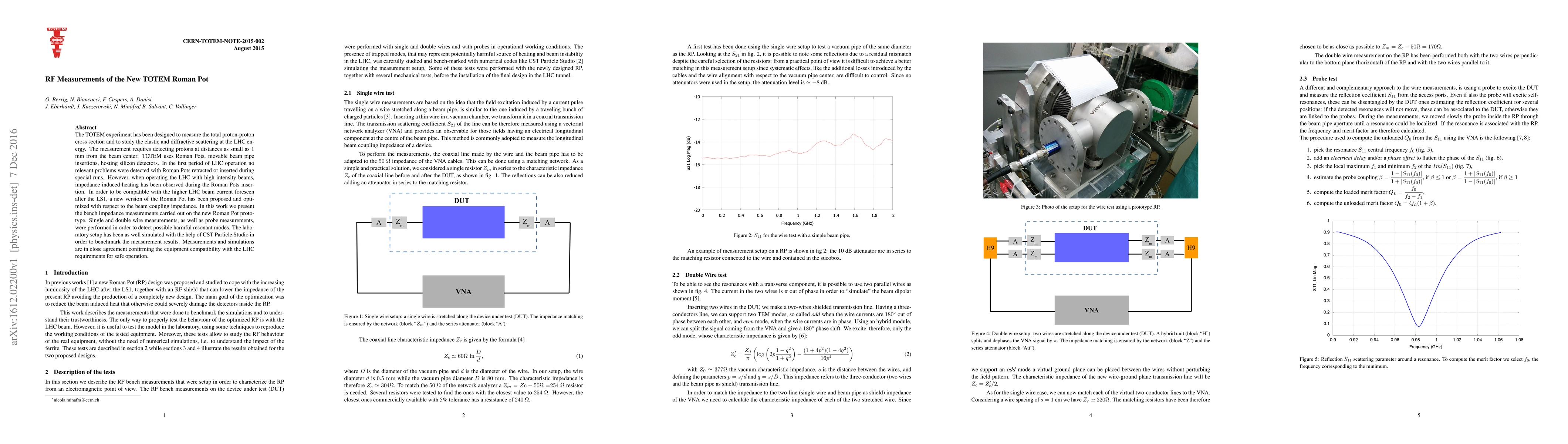 The TOTEM experiment has been designed to measure the total proton-proton cross section and to study the elastic and diffractive scattering at the LHC energy. The measurement requires detecting protons at distances as small as 1 mm from the beam center: TOTEM uses Roman Pots, movable beam pipe insertions, hosting silicon detectors. In the first period of LHC operation no relevant problems were detected with Roman Pots retracted or inserted during special runs. However, when operating the LHC with high intensity beams, impedance induced heating has been observed during the Roman Pots insertion. In order to be compatible with the higher LHC beam current foreseen after the LS1, a new version of the Roman Pot has been proposed and optimized with respect to the beam coupling impedance. In this work we present the bench impedance measurements carried out on the new Roman Pot prototype. Single and double wire measurements, as well as probe measurements, were performed in order to detect possible harmful resonant modes. The laboratory setup has been as well simulated with the help of CST Particle Studio in order to benchmark the measurement results. Measurements and simulations are in close agreement confirming the equipment compatibility with the LHC requirements for safe operation.
