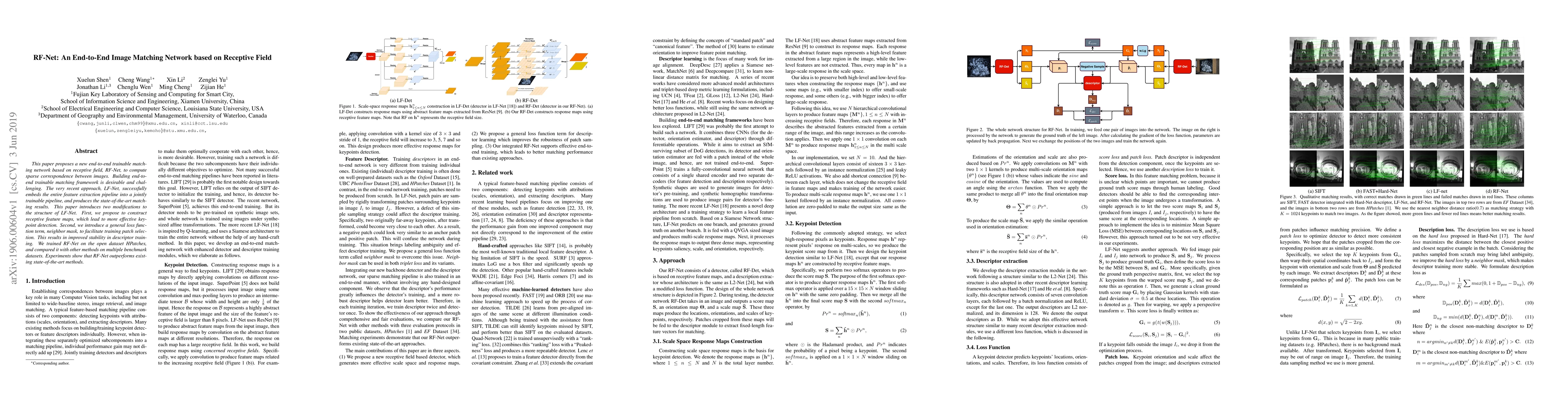 RF-Net is an end-to-end trainable image matching network that enhances keypoint detection and descriptor training through receptive feature maps and a neighbor mask loss function, outperforming existing methods on benchmark datasets.