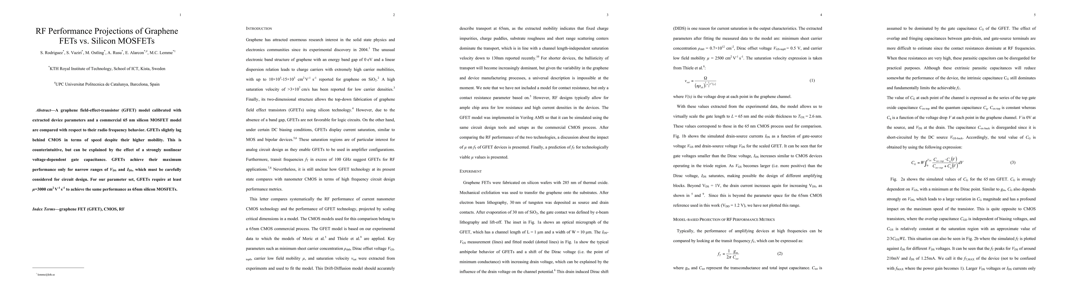 A graphene field-effect-transistor (GFET) model calibrated with extracted device parameters and a commercial 65 nm silicon MOSFET model are compared with respect to their radio frequency behavior. GFETs slightly lag behind CMOS in terms of speed despite their higher mobility. This is counterintuitive, but can be explained by the effect of a strongly nonlinear voltage-dependent gate capacitance. GFETs achieve their maximum performance only for narrow ranges of VDS and IDS, which must be carefully considered for circuit design. For our parameter set, GFETs require at least {\mu} = 3000 cm2 V-1 s-1 to achieve the same performance as 65 nm silicon MOSFETs.