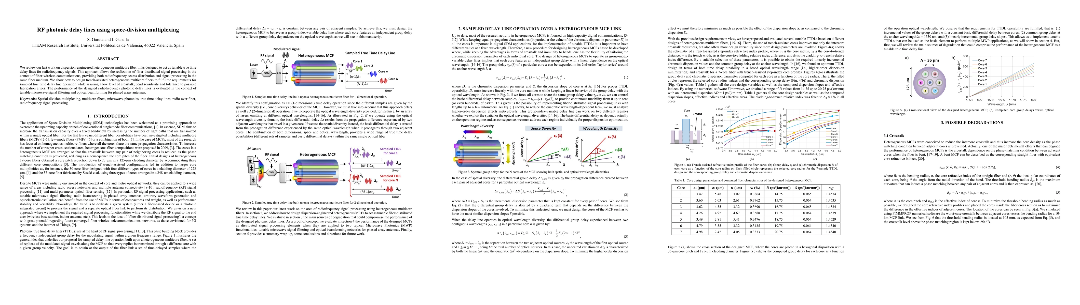 This paper reviews RF photonic delay lines using space-division multiplexing in dispersion-engineered heterogeneous multicore fibers for tunable true time delay applications. The design ensures low crosstalk and bend sensitivity, enabling fiber-wireless communications and microwave signal filtering.