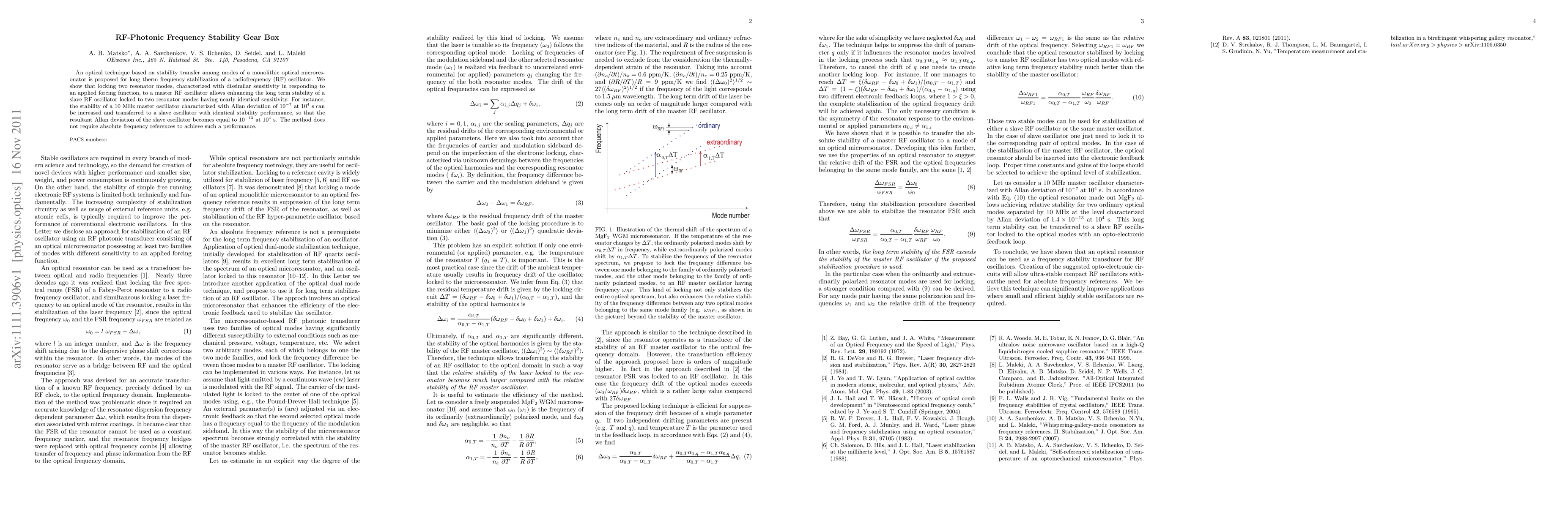 This paper proposes an optical technique using a monolithic optical microresonator to enhance the long-term frequency stability of RF oscillators. By locking two resonator modes with different sensitivities to a master RF oscillator, the stability is transferred to a slave oscillator, achieving an improved Allan deviation of 10^-13 at 10^4s without requiring absolute frequency references.