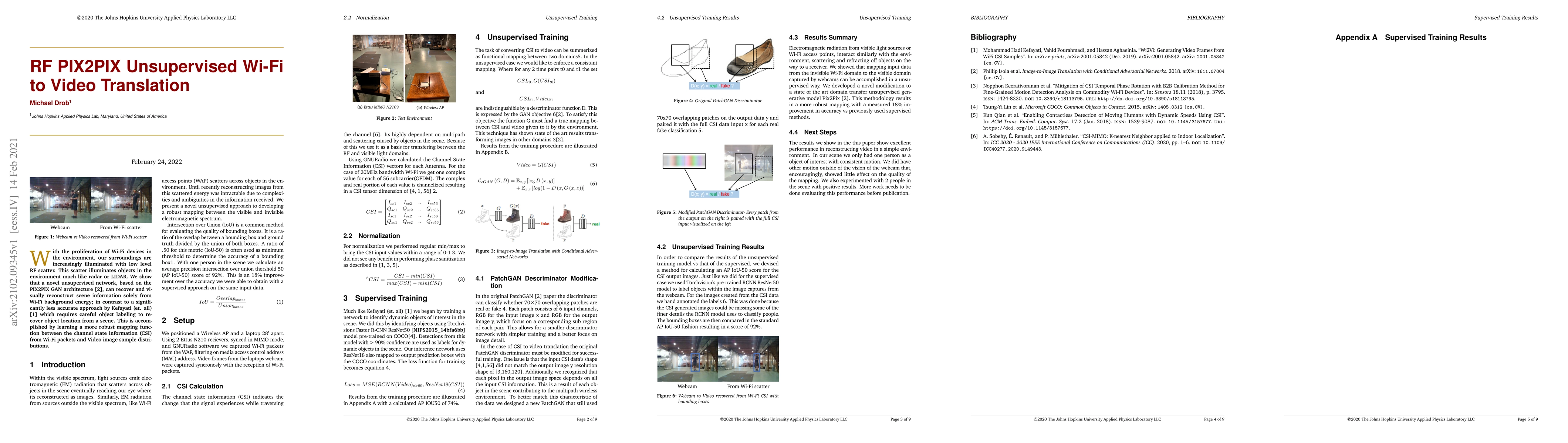 With the proliferation of Wi-Fi devices in the environment, our surroundings are increasingly illuminated with low-level RF scatter. This scatter illuminates objects in the environment much like radar or LIDAR. We show that a novel unsupervised network, based on the PIX2PIX GAN architecture, can recover and visually reconstruct scene information solely from Wi-Fi background energy; in contrast to a significantly less accurate approach by Kefayati (et. all) which requires careful object labeling to recover object location from a scene. This is accomplished by learning a more robust mapping function between the channel state information (CSI) from Wi-Fi packets and Video image sample distributions.