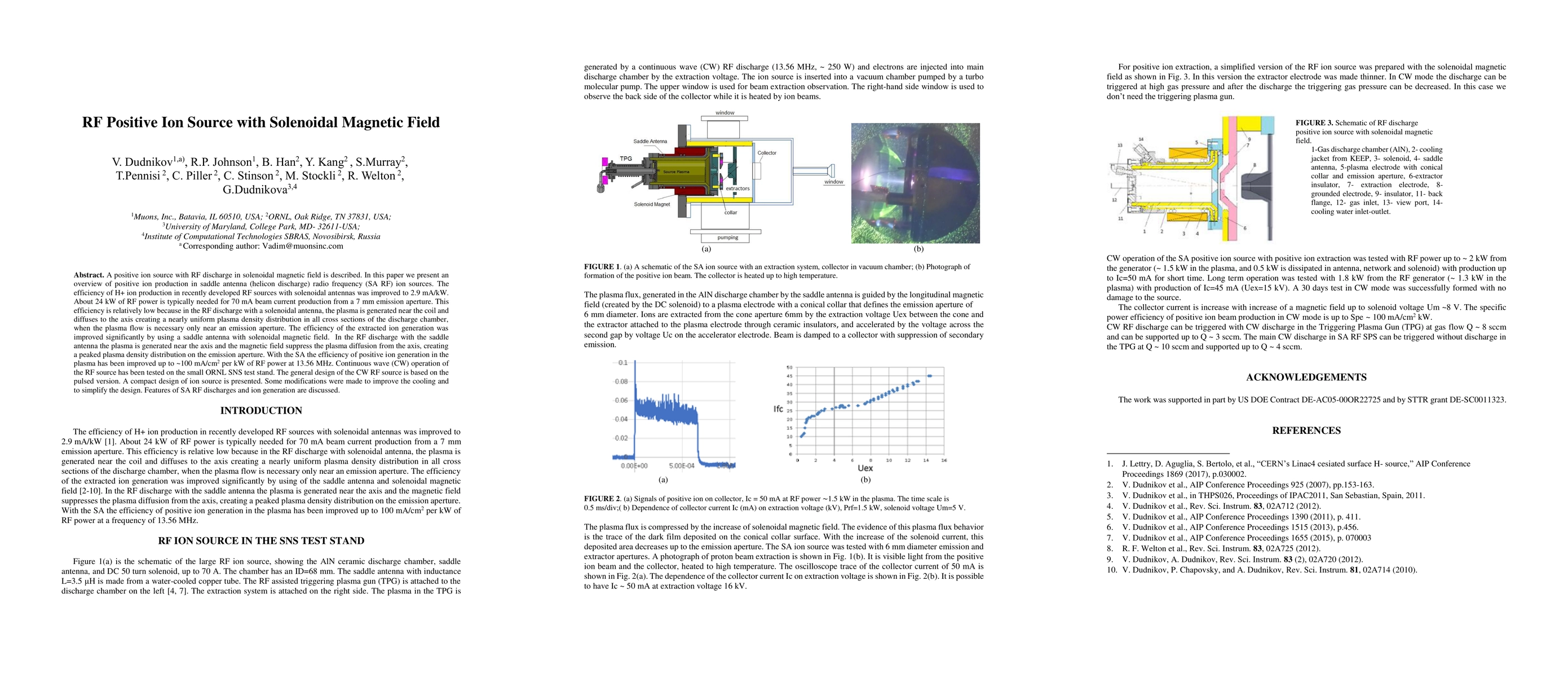 The research used a saddle antenna (helicon discharge) radio frequency (SA RF) ion source with solenoidal magnetic field to improve the efficiency of H+ ion production.