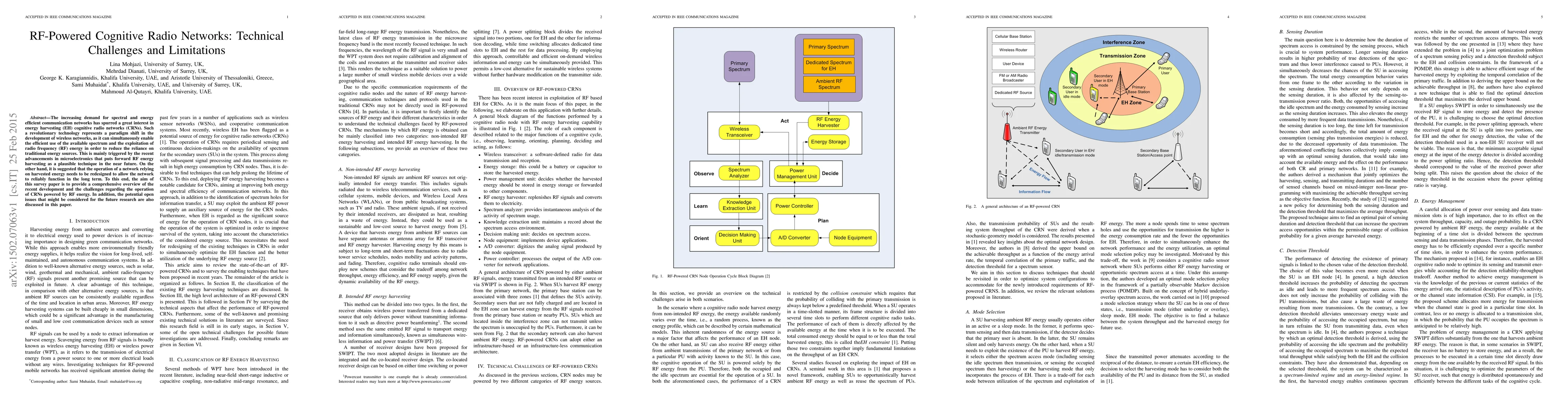 This paper surveys the technical challenges and limitations of RF-powered cognitive radio networks, emphasizing the need for spectral and energy efficiency. It highlights the potential of energy harvesting to reduce reliance on traditional energy sources, while also discussing the redesign required for long-term network reliability and identifying open issues for future research.