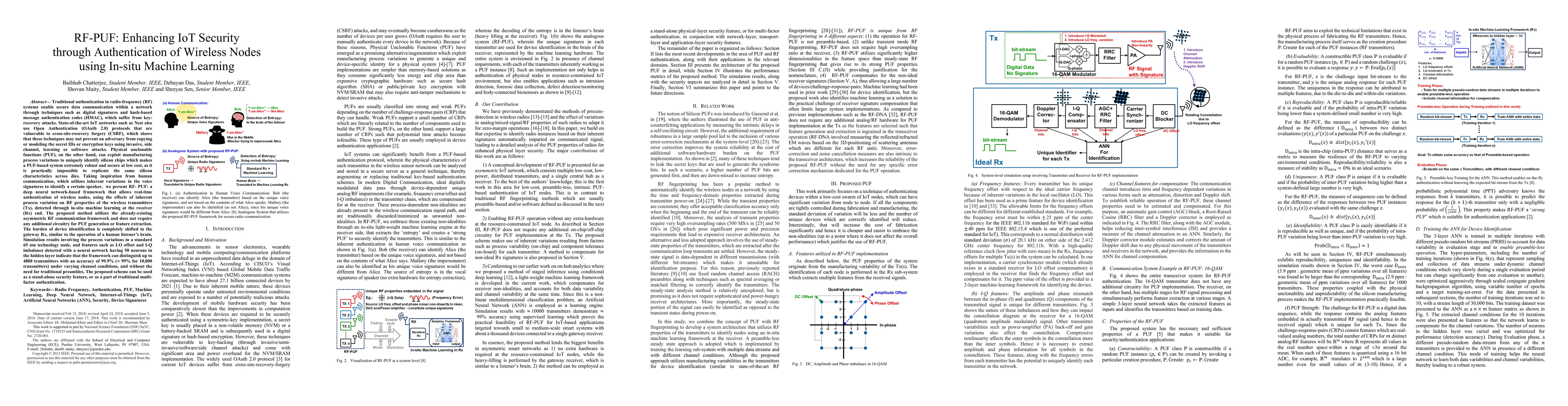 Traditional authentication in radio-frequency (RF) systems enable secure data communication within a network through techniques such as digital signatures and hash-based message authentication codes (HMAC), which suffer from key recovery attacks. State-of-the-art IoT networks such as Nest also use Open Authentication (OAuth 2.0) protocols that are vulnerable to cross-site-recovery forgery (CSRF), which shows that these techniques may not prevent an adversary from copying or modeling the secret IDs or encryption keys using invasive, side channel, learning or software attacks. Physical unclonable functions (PUF), on the other hand, can exploit manufacturing process variations to uniquely identify silicon chips which makes a PUF-based system extremely robust and secure at low cost, as it is practically impossible to replicate the same silicon characteristics across dies. Taking inspiration from human communication, which utilizes inherent variations in the voice signatures to identify a certain speaker, we present RF- PUF: a deep neural network-based framework that allows real-time authentication of wireless nodes, using the effects of inherent process variation on RF properties of the wireless transmitters (Tx), detected through in-situ machine learning at the receiver (Rx) end. The proposed method utilizes the already-existing asymmetric RF communication framework and does not require any additional circuitry for PUF generation or feature extraction. Simulation results involving the process variations in a standard 65 nm technology node, and features such as LO offset and I-Q imbalance detected with a neural network having 50 neurons in the hidden layer indicate that the framework can distinguish up to 4800 transmitters with an accuracy of 99.9% (~ 99% for 10,000 transmitters) under varying channel conditions, and without the need for traditional preambles.