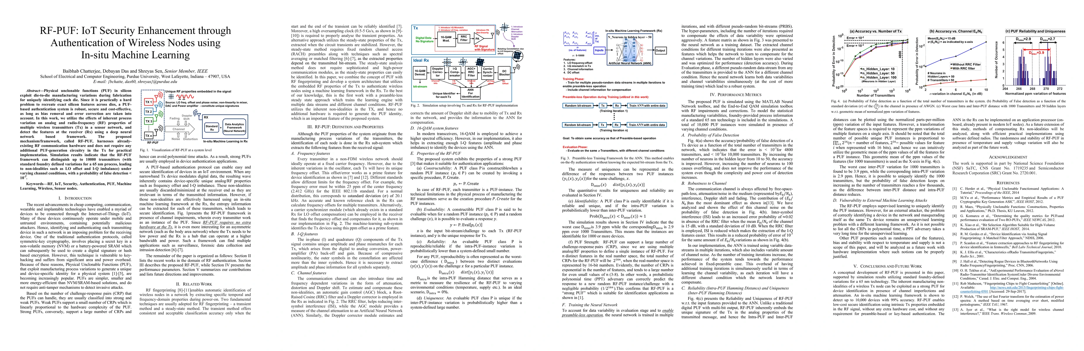 Physical unclonable functions (PUF) in silicon exploit die-to-die manufacturing variations during fabrication for uniquely identifying each die. Since it is practically a hard problem to recreate exact silicon features across dies, a PUFbased authentication system is robust, secure and cost-effective, as long as bias removal and error correction are taken into account. In this work, we utilize the effects of inherent process variation on analog and radio-frequency (RF) properties of multiple wireless transmitters (Tx) in a sensor network, and detect the features at the receiver (Rx) using a deep neural network based framework. The proposed mechanism/framework, called RF-PUF, harnesses already existing RF communication hardware and does not require any additional PUF-generation circuitry in the Tx for practical implementation. Simulation results indicate that the RF-PUF framework can distinguish up to 10000 transmitters (with standard foundry defined variations for a 65 nm process, leading to non-idealities such as LO offset and I-Q imbalance) under varying channel conditions, with a probability of false detection < 10e-3