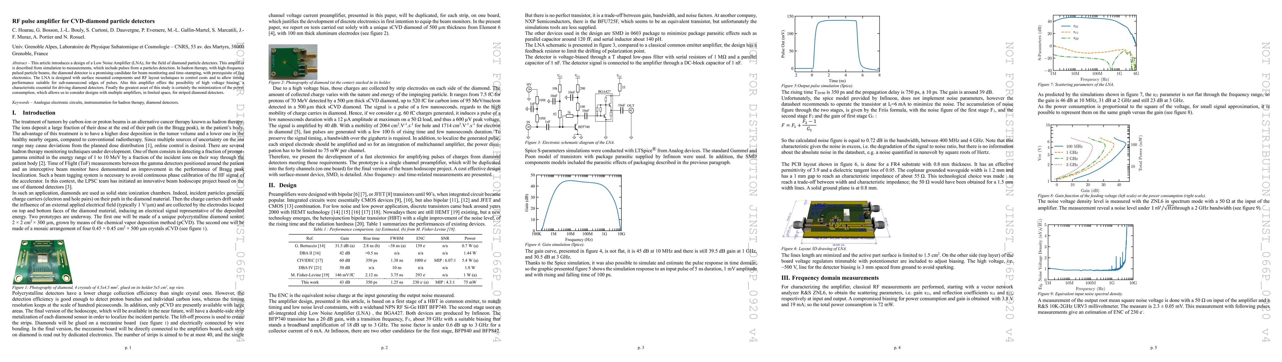 The research details the design and testing of a Low Noise Amplifier (LNA) for diamond particle detectors, utilizing surface-mounted components and RF layout techniques for cost control and timing performance. Simulations using LTSpice® and Spice S-parameters are conducted to analyze performance, with focus on gain, noise figure, and pulse response.