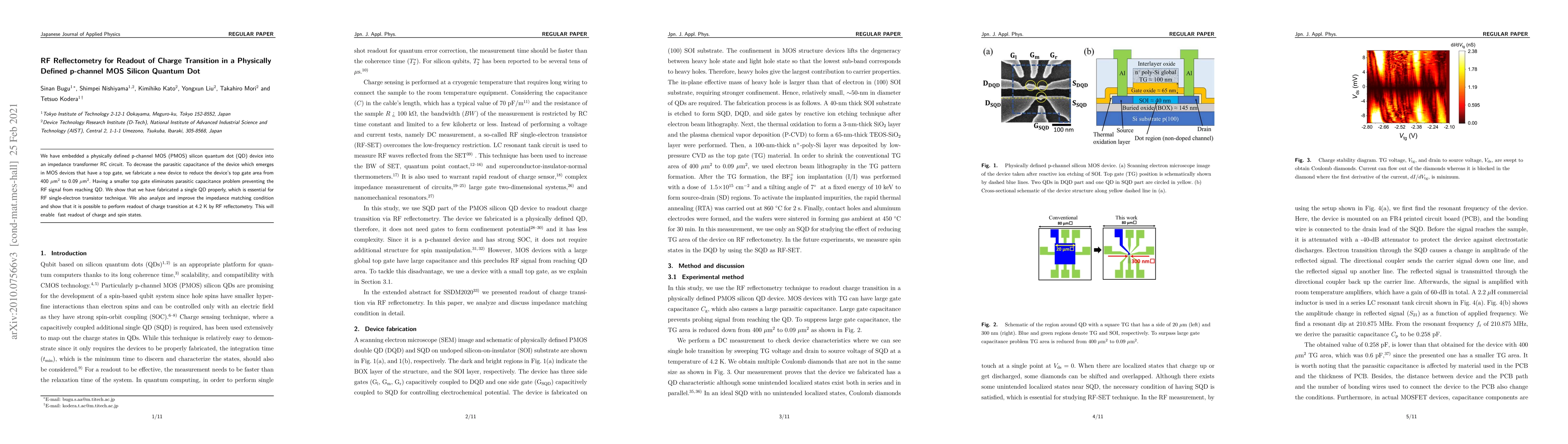 We have embedded a physically defined p-channel silicon MOS quantum dot (QD) device into an impedance transformer RC circuit. To decrease the parasitic capacitance and surpass the cutoff frequency of the device which emerges in MOS devices that have a top gate and act as RC low-pass filter, we fabricate a new device to reduce the device's top gate area from 400 $\mbox{$\mu$m}^2$ to 0.09 $\mbox{$\mu$m}^2$. Having a smaller top gate eliminates the cutoff frequency problem preventing the RF signal from reaching QD. We show that we have fabricated a single QD properly, which is essential for RF single-electron transistor technique. We also analyze and improve the impedance matching condition and show that it is possible to perform readout of charge transition at 4.2 K by RF reflectometry, which will get us to fast readout of charge and spin states.